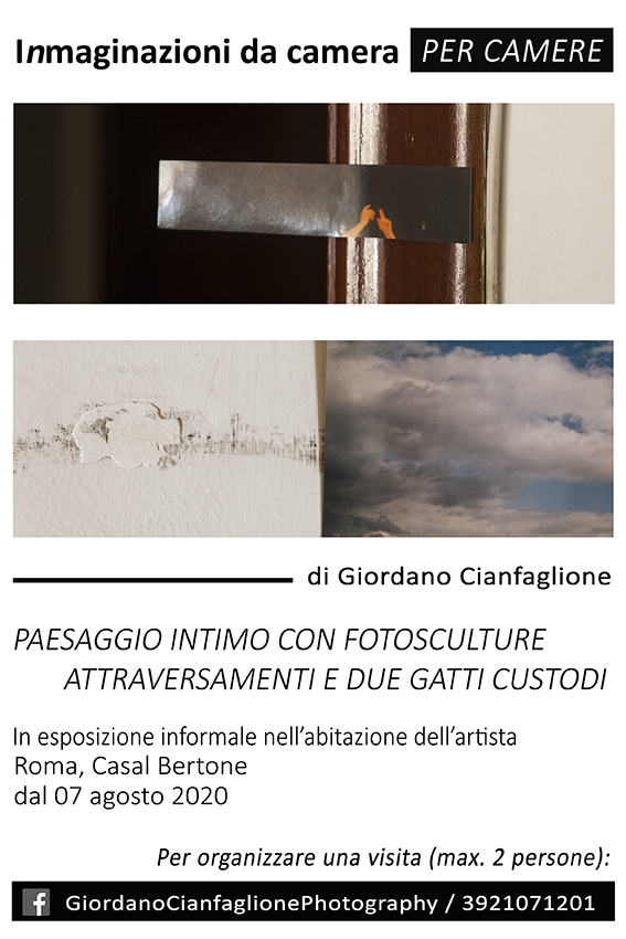 Senza una data di termine stabilita, si inaugura il 7 agosto nell’abitazione del fotografo Giordano Cianfaglione, l'esposizione ‘’Inmaginazioni da camera/PER CAMERE’’. L’esposizione vuole esplorare la fotografia trattando le immagini come sculture installate nello spazio. In maniera del tutto informale, i visitatori verranno invitati ad immergersi in questo paesaggio intimo con fotosculture, attraversamenti e due gatti custodi. Un’opera di fotografie-pezzi di vita che nel corso del tempo hanno assunto la forma espositiva attuale, in un tutt’uno organico con l’ambiente abitativo. Ma che proprio per questo è in continua mutazione, anche se per lunghi tratti in maniera quasi invisibile.