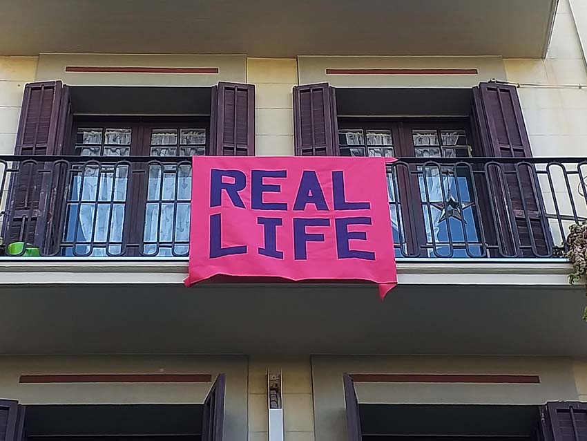 Durante i mesi di confinamento, l’artista ha esposto dal suo balcone le bandiere realizzate mettendo in relazione il rapporto tra pubblico e privato, virtuale e reale, pensiero e simulazione. I messaggi scritti sono brevi testi, frasi evocative o semplici domande sul mondo digitale e su Internet.