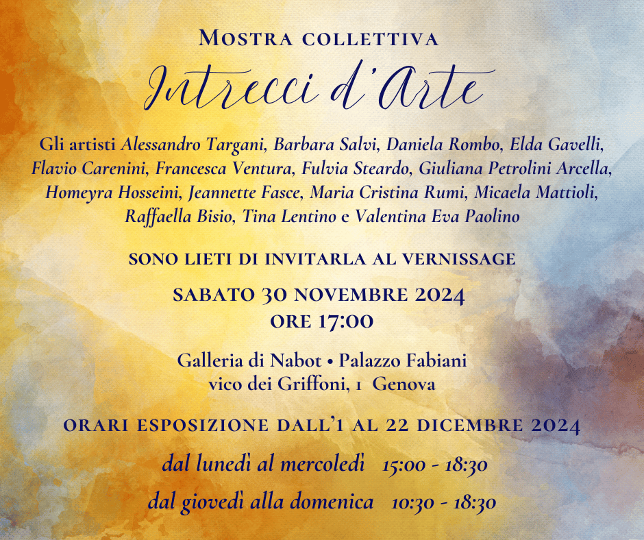 torna ai comunicati stampa Intrecci d’Arte Arte Vico dei Griffoni, 1 Genova , Genova , Ge, 16100, Italia 30/11/2024 - 22/12/2024 Mostra collettiva di artisti emergenti Scarica il comunicato