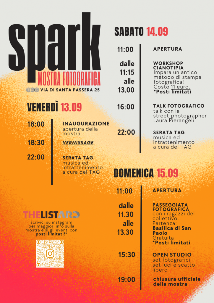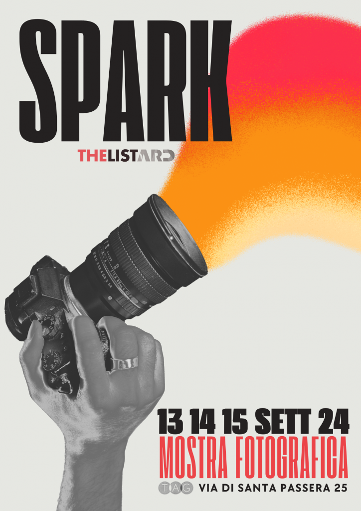 Roma, 04 Settembre 2024. TheListARD Collective presenta SPARK, venerdì 13 settembre dalle ore 18:00 presso la Tevere Art Gallery di Roma. La mostra collettiva introduce al pubblico romano 28 fotografe e fotografi da tutta Italia. Le oltre 80 fotografie presentate in allestimento vogliono promuovere attraverso il ritratto, la fotografia documentaria, fino alla street photography, un percorso attraverso le progettualità di ciascuna autrice e autore aprendo un confronto su temi di attualità e autorialità.