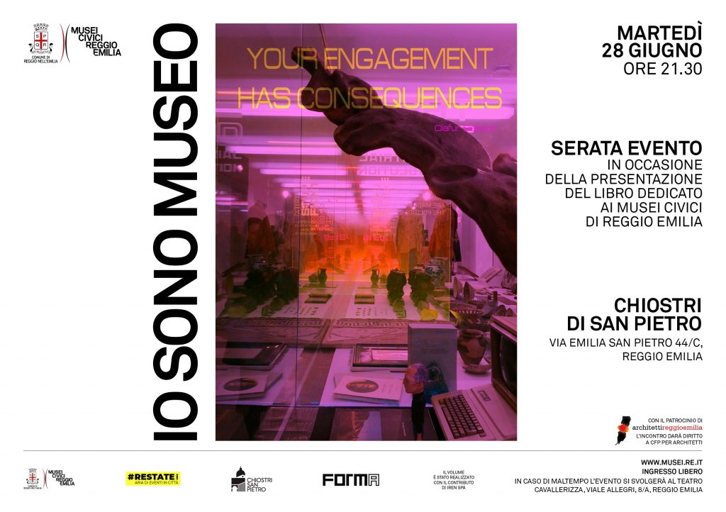 La serata è promossa dal Comune di Reggio Emilia – Musei Civici in collaborazione con Forma Edizioni, nel contesto del cartellone di attività Restate, con il patrocinio dell’Ordine degli Architetti di Reggio Emilia. Il volume Io sono Museo è realizzato con il contributo di Iren S.p.A.
