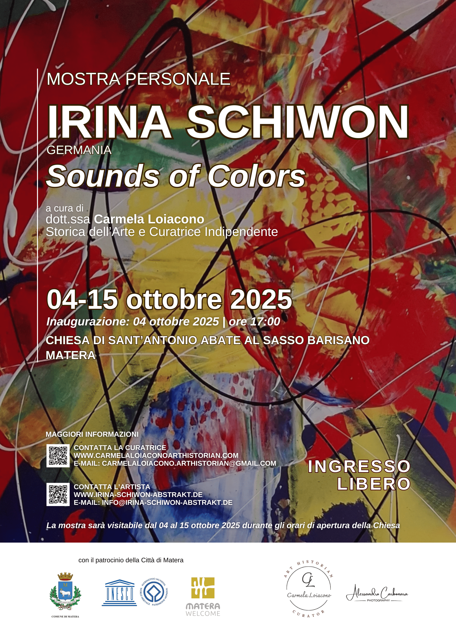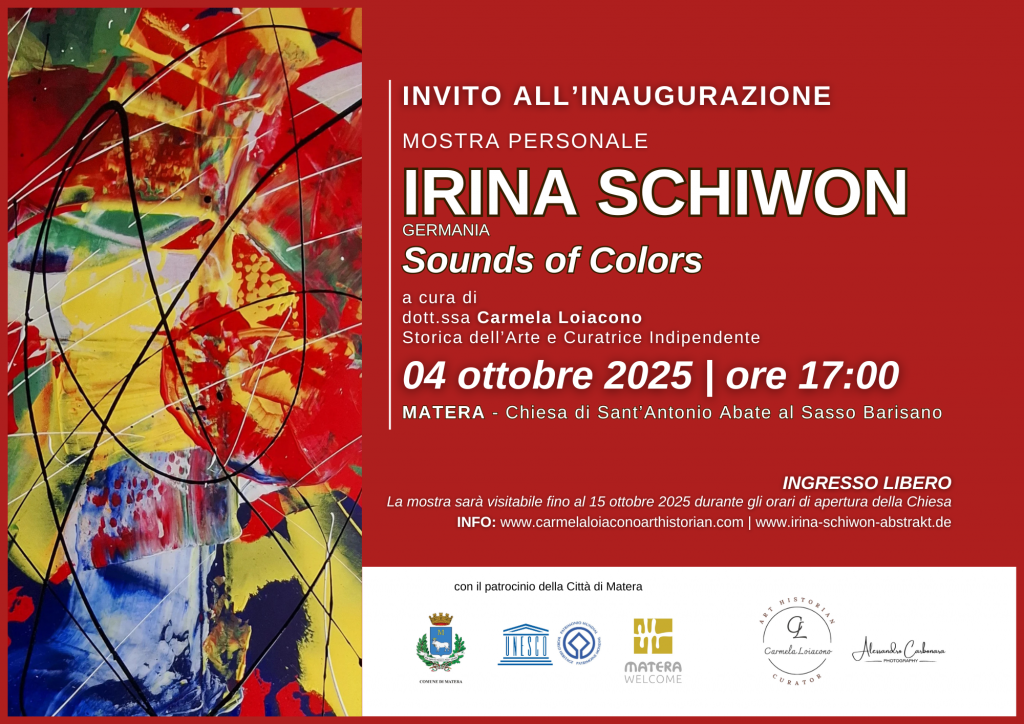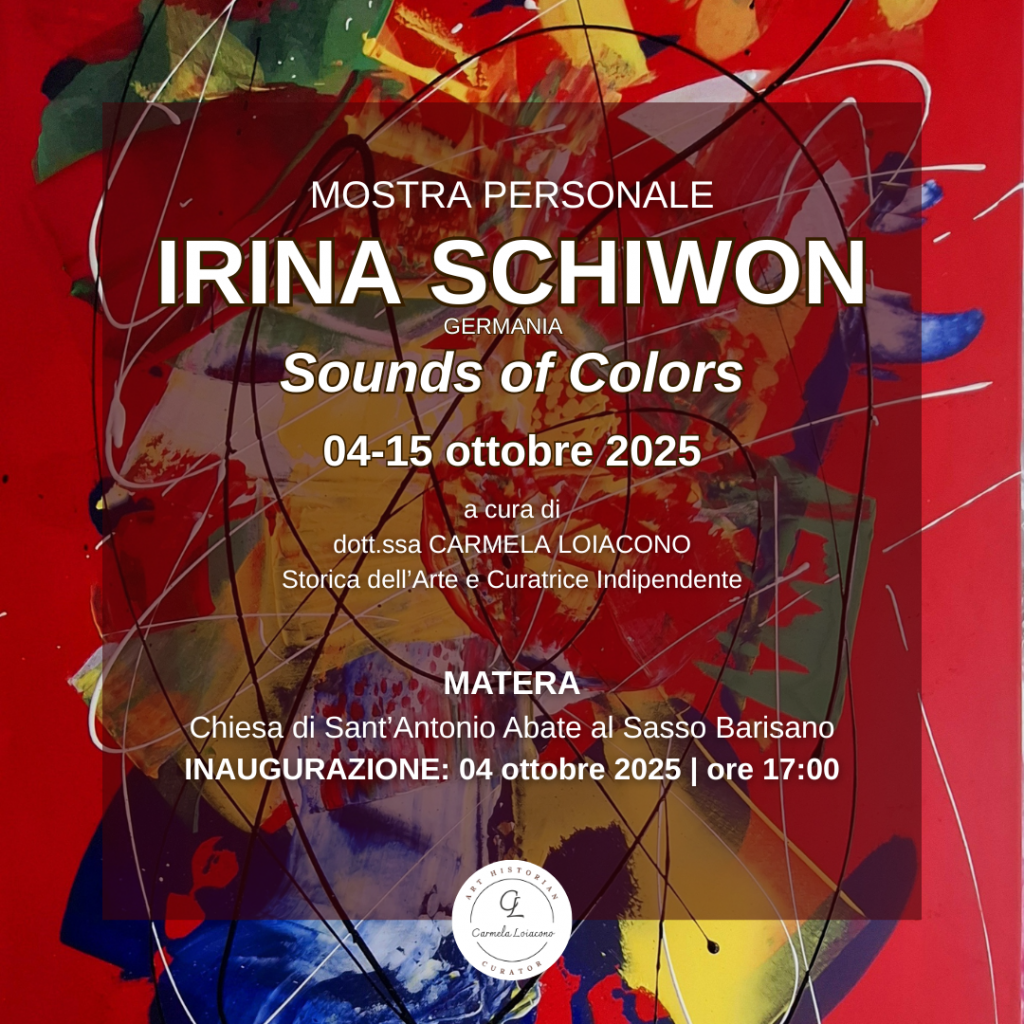 Sabato 04 ottobre 2025 a partire dalle ore 17:00, presso la Chiesa di Sant’Antonio Abate al Basso Barisano in via Sant’Antonio Abate a Matera, è in programma l'inaugurazione della mostra personale “Irina Schiwon: Sounds of Colors”.
