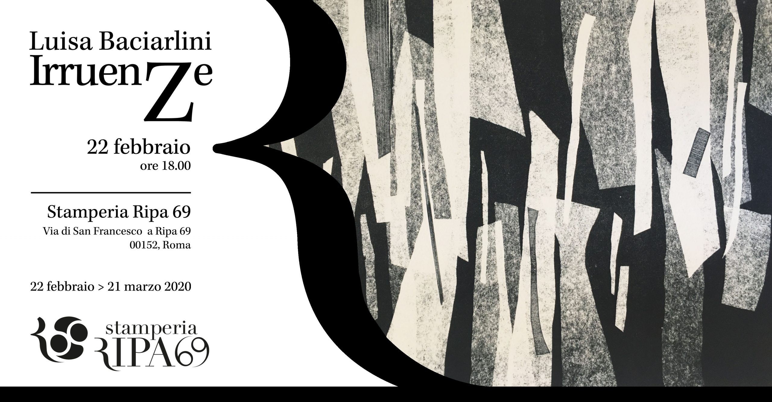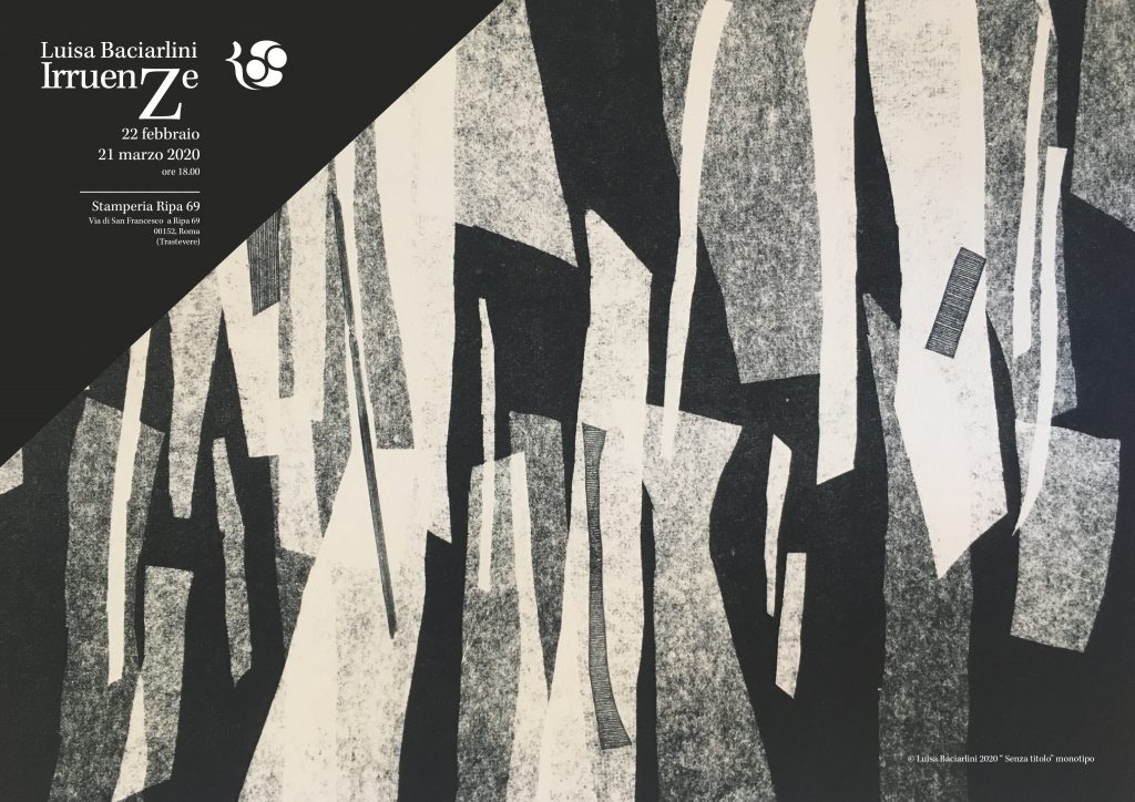 In questa mostra personale Luisa Baciarlini fa partecipi i visitatori di una fase della sua ricerca volta a esplorare la ricchezza espressiva possibile compresa tra il nero e il bianco.