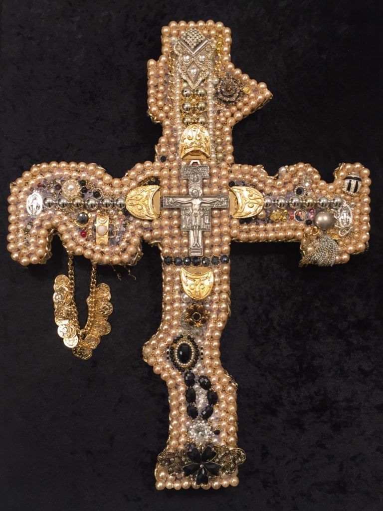 Si tratta di 12 opere realizzate con oggetti di recupero e di riciclo industriale, come crocifissi, metallo, specchi, miscellanee di perle e bijoux per lo più vintage, che l'artista ricerca in tutto il mondo, realizzando così una sorta di “Ricerca sull’archeologia industriale” dei nostri tempi.