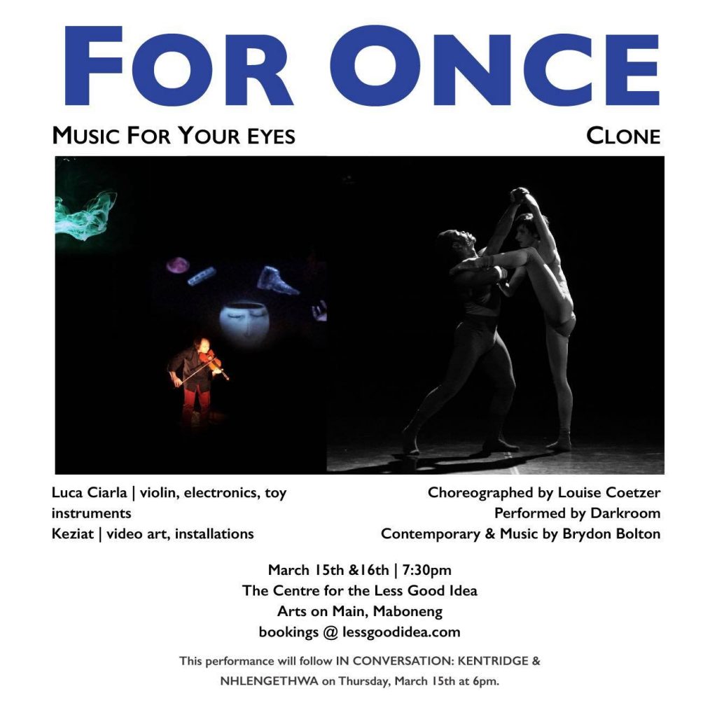 In Music for your eyes, Keziat e Luca Ciarla esplorano le varie possibili interazioni tra le due arti; un duo inusuale che prende per mano il pubblico per guidarlo lungo percorsi immaginari dove le note si trasformano in colori, i suoni diventano immagini. Un viaggio suggestivo e visionario in cui le video proiezioni di Keziat, realizzate come vere e proprie video installazioni site specific su veli, stoffe o superfici non convenzionali si fondono, contaminandosi, con la sorprendente musica del violinista Luca Ciarla.