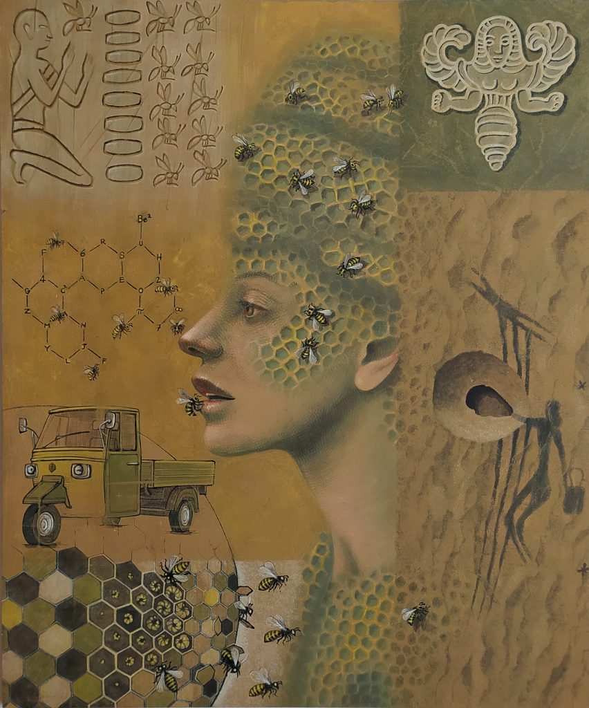 Vi sono animali che vivono in società organizzate, dove ogni individuo ha un ruolo prestabilito e lavora per il bene comune: le termiti, le formiche, le api... no, inutile cercare l'uomo nell'elenco, l'uomo non sa ragionare in termini di sacrificio personale, bene comune, crescita collettiva... Tanto meno lo sanno fare i politicanti di mestiere. Vania Elettra Tam ha un dono raro: sa vedere oltre la barriera dei comunicati ufficiali, sa cogliere la realtà del momento, spesso volutamente offuscata e, ancor più, sa intuire ciò che sarà, attraverso l'infallibile sfera di cristallo della sua arte. Così, fluttuando tra lo stato onirico, la razionalità e la creatività, Vania ha immaginato una società matriarcale, sull’esempio del sistema organizzativo proposto dagli insetti sociali, (contrapposti alla dannosità degli inutili parassiti) e in sostituzione del fallimentare modello maschile. Nel ciclo "Kimere", donne-regine dirigono società ispirate a formiche, termiti, api, a delineare mondi perfetti, vere e proprie utopie sostenibili. Sintesi profonde, espresse con chiarezza e ironia, come nel caso del castoro, costruttore e riutilizzatore, capace di "fare diga" contro le difficoltà. L' autoritaria figura femminile (coi capelli raccolti a coda di castoro) incarna l'alternativa per una ricostruzione sostenibile, espressa dall'accostamento tra gli igloo di Merz e le tane dei Castori, in una sorta di ribaltamento logico, a suggerire come la realtà debba rifarsi all'arte e non viceversa. Il messaggio si fa più sorridente e giocoso allorché la “cacciatrice di utopie” si trova al cospetto degli uccelli tessitori, mimetizzata con un copricapo a forma di nido, in perfetta armonia con la natura e nel rispetto delle diversità. Un richiamo alla responsabilità di ognuno, alla necessità di ricostruire al meglio, di ripartire nella consapevolezza che "l'arte lo dice prima, l'arte lo dice meglio..." Carlo Micheli