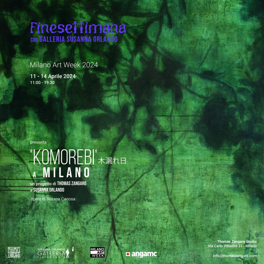 In collaborazione con la galleria Susanna Orlando di Pietrasanta, Thomas Zangaro Studio ospita le opere di Susana Canosa nell'ambito del progetto Komorebi. Il termine giapponese si riferisce al suggestivo fenomeno creato dalla luce che filtra tra le foglie degli alberi, a indicare la natura attrazione dell'uomo verso il sole. L'evento si inserisce all'interno del progetto Finesettimana, promosso da Thomas Zangaro Studio, che si pone come luogo di narrazione tra progettazione e opera d’arte. Nelle sale di interior design, vengono ospitate mostre che dialogano con l'oggetto di design creando continuità tra progettazione, opera d’arte e oggetto offrendo una lettura interdisciplinare tra le tre realtà