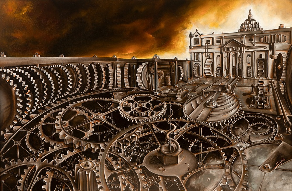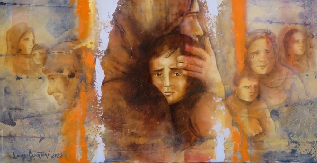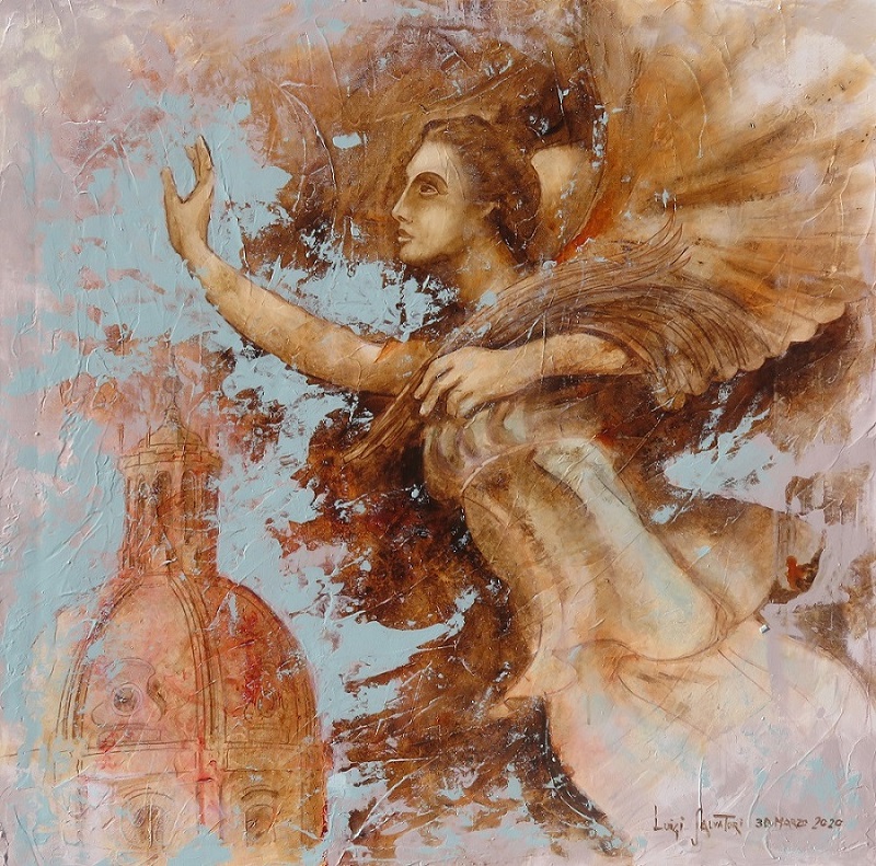 La pittura di Antonio Servillo si inserisce in questa dialettica del reale, tra la ricerca di un paradiso perduto ed il rischio di sprofondare nell’abisso, nel tentativo di capire dove si orienta l’attuale società. Egli si dimostra sensibile agli avvenimenti dell’ultimo quarantennio di storia, da quando cioè ha iniziato la sua attività pittorica: i suoi quadri fioriscono sul terreno della globalizzazione negli anni 80 del secolo scorso, del crollo del muro di Berlino nel 1989, delle guerre successive, della diffusione di Internet negli anni 90, nel crollo delle torri gemelle del 2001, del terremoto del 2002, della pandemia degli ultimi anni, dell’affievolimento della fede cristiana e di altre religioni, che continuano comunque a dare un orientamento che va oltre i confini della vita umana.