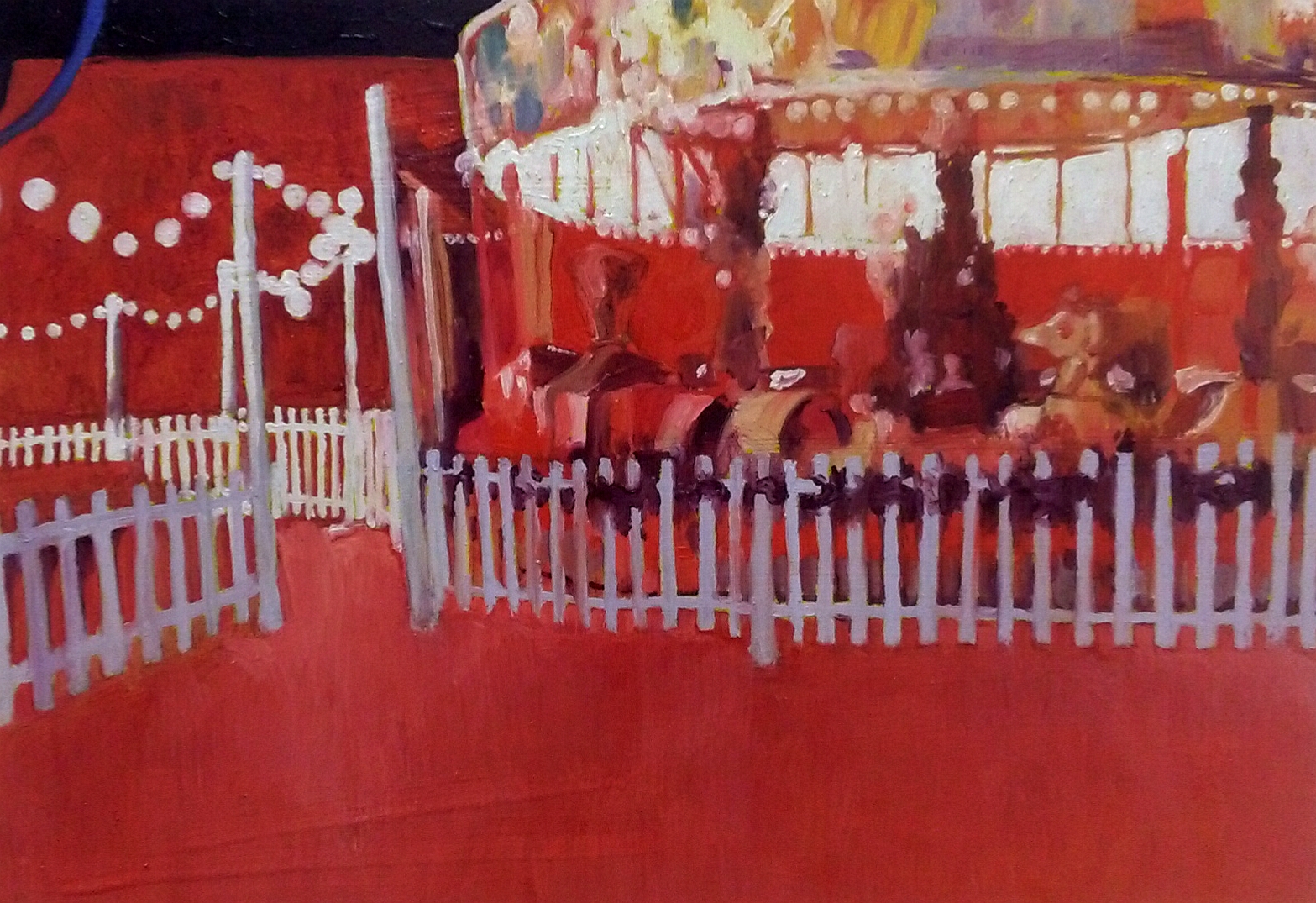 L’artista e scenografo teatrale Guido Buganza presenta una serie di dipinti site-specific sul tema del Luna Park. Una sequenza inesauribile di accostamenti cromatici dei più svariati, dove la luce impietosa, attonita e sterminata dei pomeriggi estivi sia alterna alla sontuosa artificiosità dei notturni, la cui gioia disperata appare quale celebrazione effimera delle miserie umane.
