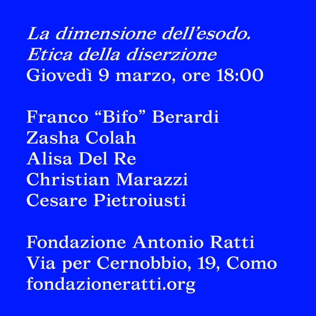 La dimensione dell'esodo. Etica della diserzione è la prima di due tavole rotonde organizzate da Fondazione Antonio Ratti e Ordet. Il secondo incontro si terrà a Milano nel mese di maggio.