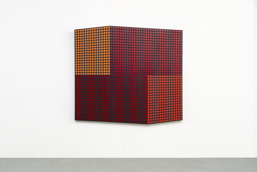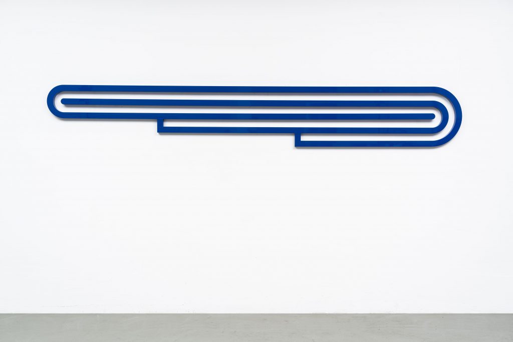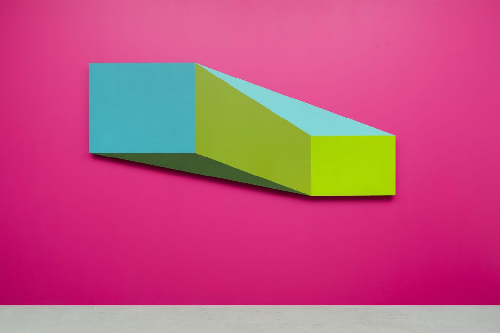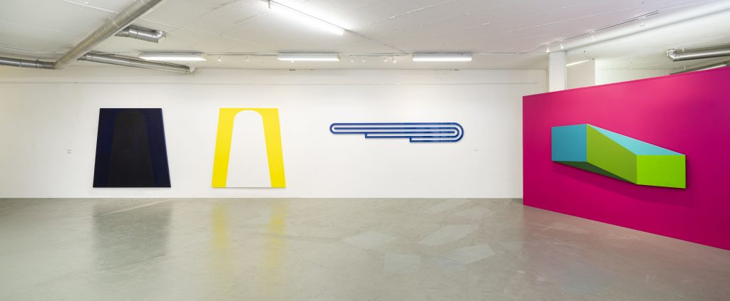 Sono in mostra opere inedite di grande formato che rappresentano le ricerche più recenti dell’artista piemontese, orientate verso una rigorosa attenzione alla composizione formale e cromatica. Nel corso degli ultimi quindici anni Mega si è progressivamente allontanato da qualunque istanza figurativa —che aveva segnato la prima fase del suo lavoro— dedicando una radicale attenzione alla struttura compositiva declinata attraverso la creazione di forme/oggetto che interagiscono sul piano percettivo con l’osservatore. Le grandi tele sagomate rimandano, in chiave innovativa, a uno dei grandi temi della pittura occidentale: la rappresentazione tridimensionale sul piano bidimensionale, attraverso l’inganno prospettico e l’uso percettivo dei colori. Oltre alle tele dipinte di grandi dimensioni si affiancano le grandi sculture in alluminio verniciato, accostando esplicitamente la composizione visiva a quella musicale. La ricerca artistica di Piero Mega si caratterizza per la sua rigorosità e profondità sugli elementi pittorici, riproponendo le questioni fondamentali della pittura senza alcuna etichetta predefinita.