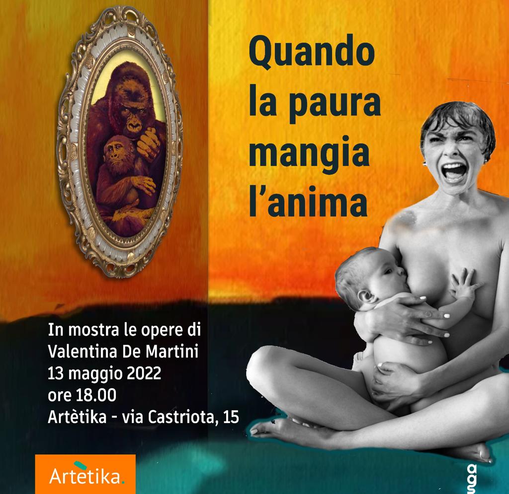 Animali, bambini che urlano e un richiamo al rispetto per la natura e per la vita degli esseri umani, mai come in questi tempi, calpestate e messe a rischio da altri uomini. Si intitola “Quando la paura mangia l'anima” la mostra delle opere della pittrice romana Valentina De Martini, con cui Artètika, storica galleria d’arte, cambia veste. Nuovi locali, nuovo logo e nuova guida. La fondatrice Gigliola Beniamino passa, infatti, il testimone alla figlia Esmeralda Magistrelli e Artètika conquista il cuore di Palermo, alle spalle del Giardino Inglese, in via Giorgio Castriota, 15. Il logo si arricchisce di un accento colorato sulla E, per sottolineare il legame tra arte ed etica. È previsto per venerdì 13 maggio, alle ore 18.00, il taglio del nastro dell’esposizione curata da Federica Di Stefano e presentata dalla giornalista Licia Raimondi. Sarà presente l'artista. Ingresso gratuito. Per informazioni: 327 133 6080