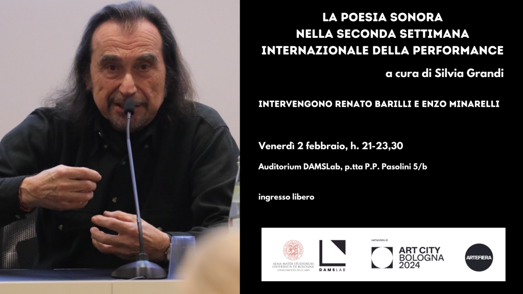 Il programma della serata prevede la proiezione di filmati di esibizioni di poeti sonori che parteciparono alla seconda Settimana Internazionale della Performance, tenutasi nel 1978 alla GAM di Bologna.