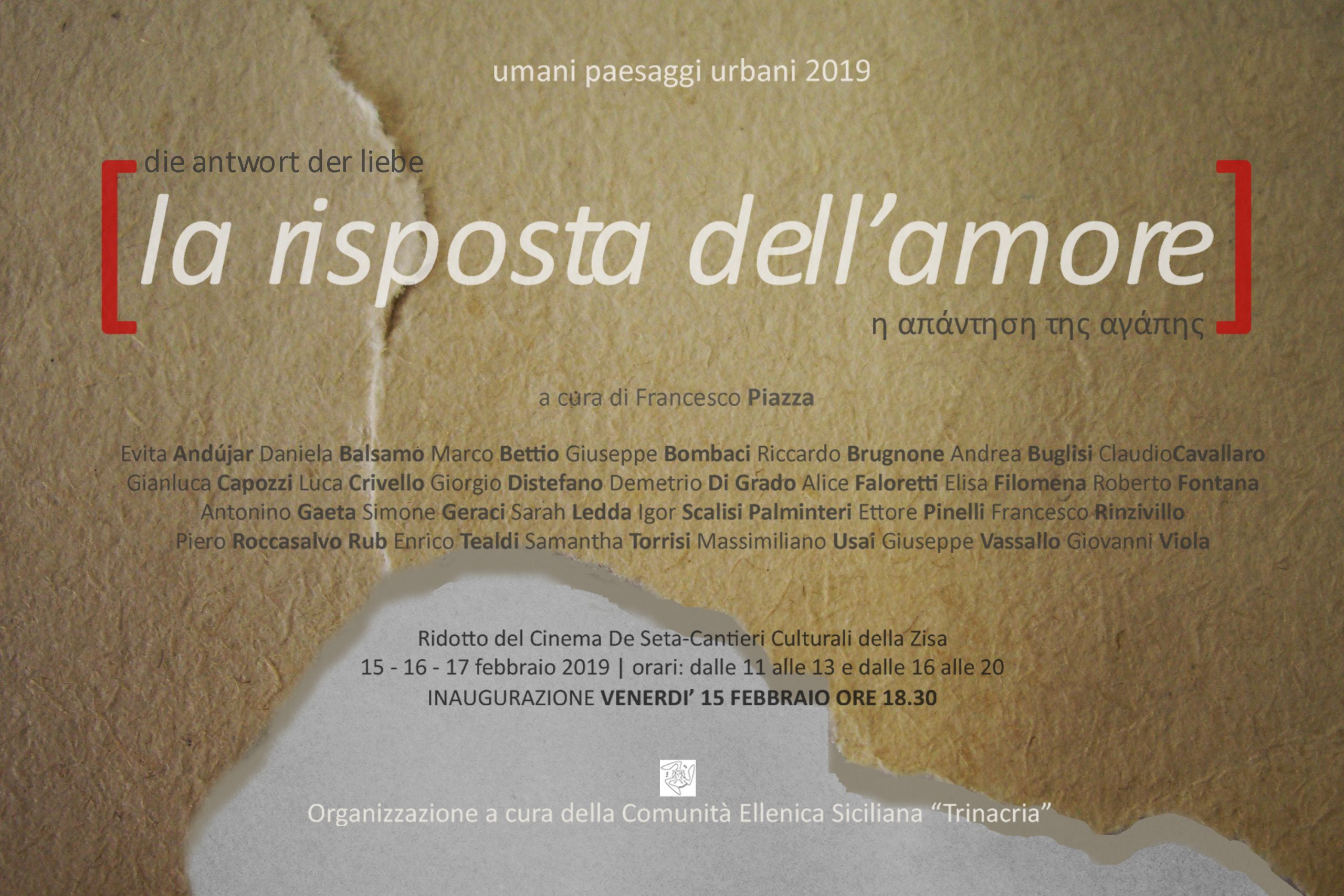 LA RISPOSTA DELL'AMORE (Die antwort der liebe) è il titolo dell'omonimo libro di Erich Fromm. In questo volume l'autore parla di Odio. Dei suoi molteplici significati e di come esso possa manifestarsi e modificare i rapporti tra gli uomini e l'ambiente che li circonda. 26 artisti in una mostra evento, unica nel suo genere, raccontano la loro idea di paesaggio fisico e psicologico in cui il dualismo odio/amore rappresenta il tema principale.