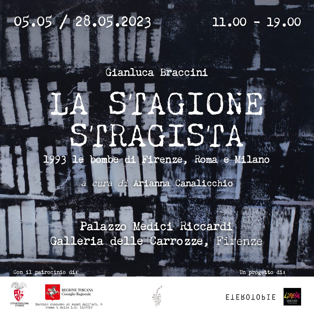 Dal 5 al 28 maggio la Galleria delle Carrozze di Palazzo Medici Riccardi ospita La Stagione Stragista, 1993 le bombe di Firenze, Roma e Milano, una mostra di Gianluca Braccini a cura di Arianna Canalicchio. Il progetto, realizzato con il patrocinio della Città Metropolitana di Firenze e del Consiglio Regionale della Toscana, è stato organizzato dall’Associazione culturale Eterotopie in collaborazione con Libera Toscana.