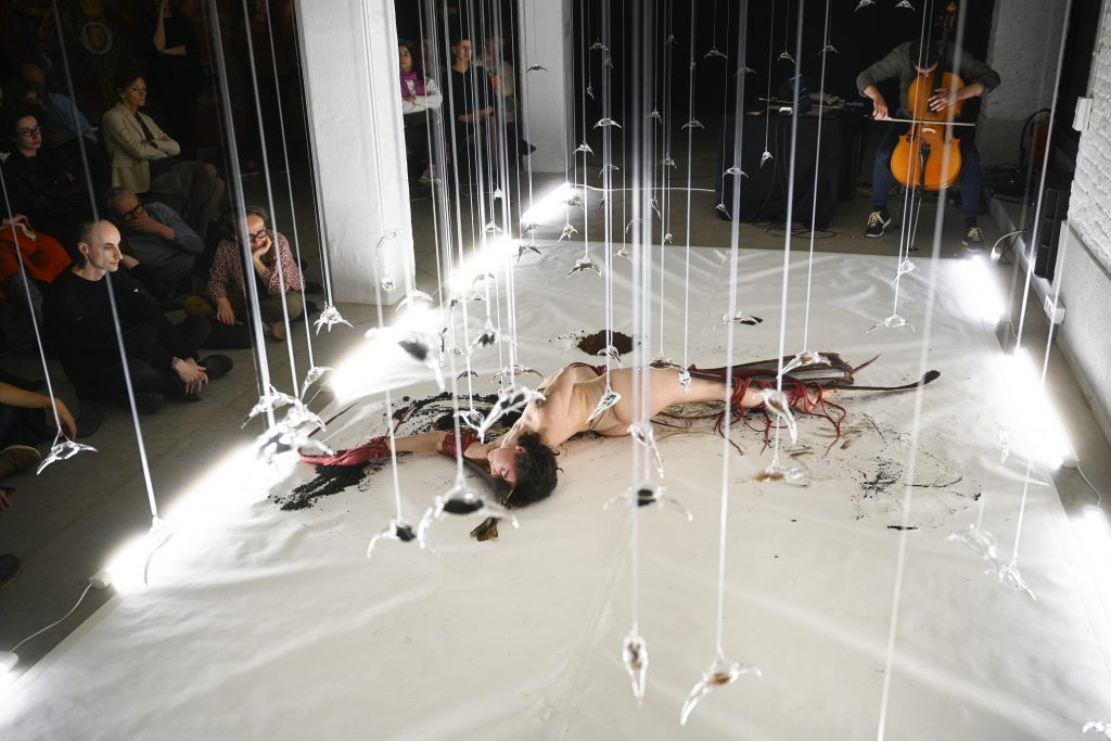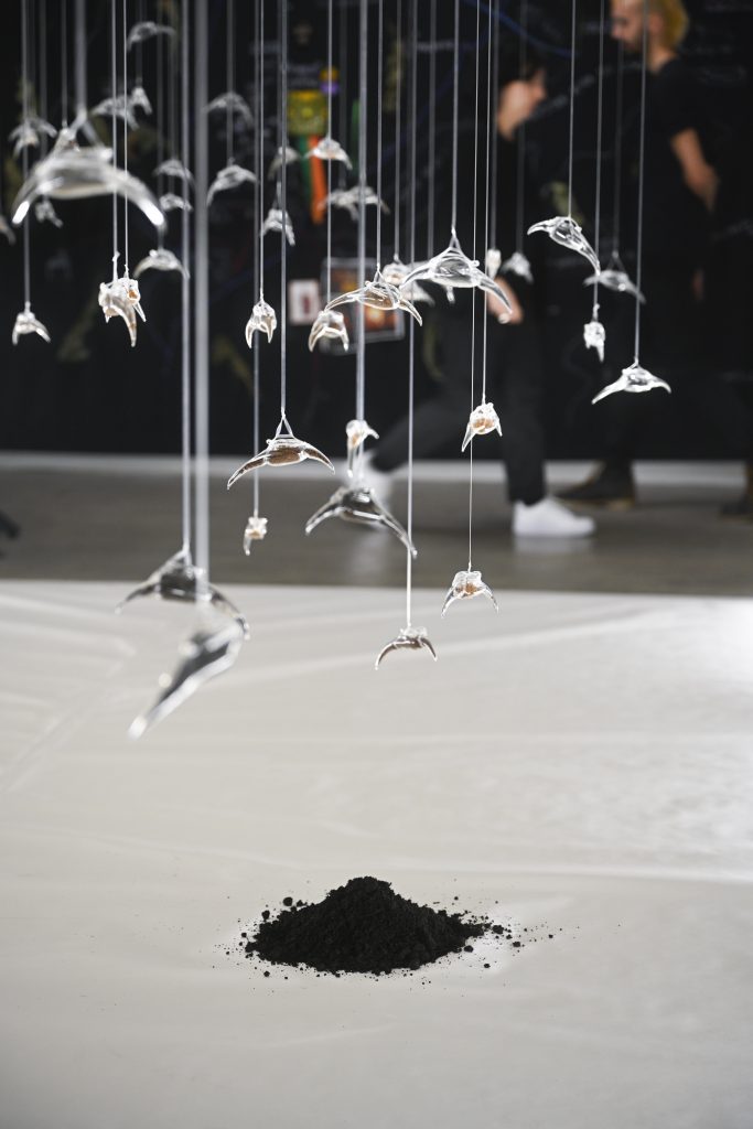 Lament, which is currently exhibited at Brussels’ iMAL – Art center for digital cultures and technology, calls us to encounter a death bed, a white colour-dominated setting with traces of soil on a milky floor surface. Above it, as if they are levitating, we see one hundred organically-shaped glass sculptures. As we find out, they contain soil microbes, charcoal, and moss which Pevere herself collected after visiting wildfire areas across Europe. With her distinctive embrace of living matter as an artistic tool, Pevere treated the materials reflecting on how their transformation can unfold stories of urgency, death and rebirth. And it is exactly this transformation of the artwork that repeat visitors will notice – growing out of their glass habitats at iMAL, the seemingly dead matter comes back to life.