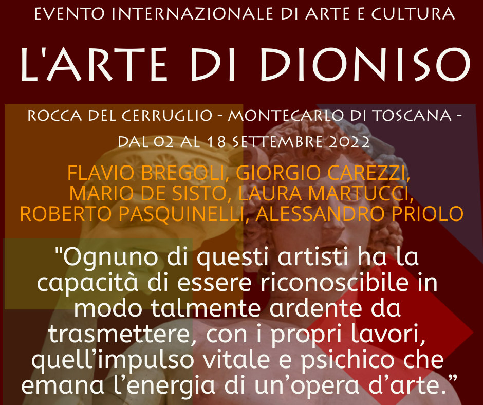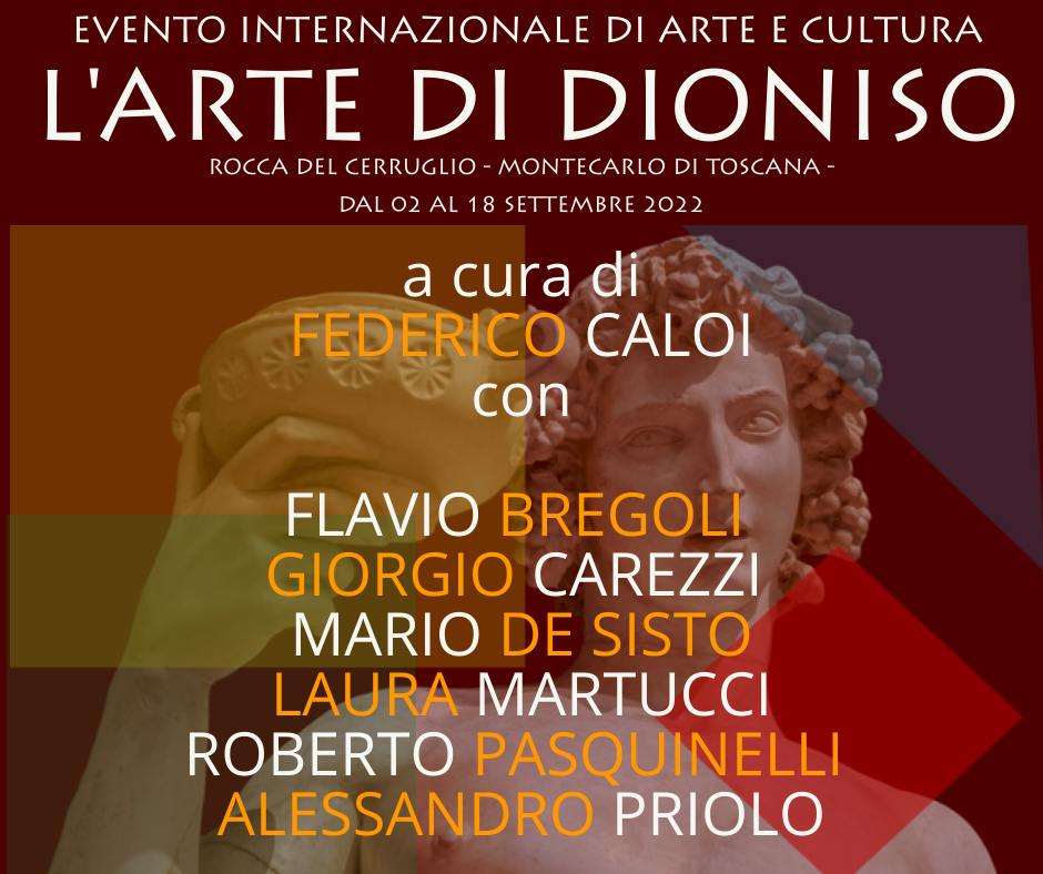 A MONTECARLO DI TOSCANA, in provincia di Lucca si svolgerà dal 02 al 18 settembre 2018, presso la ROCCA DEL CERRUGLIO, l’evento internazionale di arte e cultura “L’ARTE DI DIONISO”. La mostra è promossa con il patrocinio del comune di Montecarlo, ed è inserita nell’ambito della Festa del Vino 2022, manifestazione che vede numerose iniziative culturali di questa famosa località turistica.