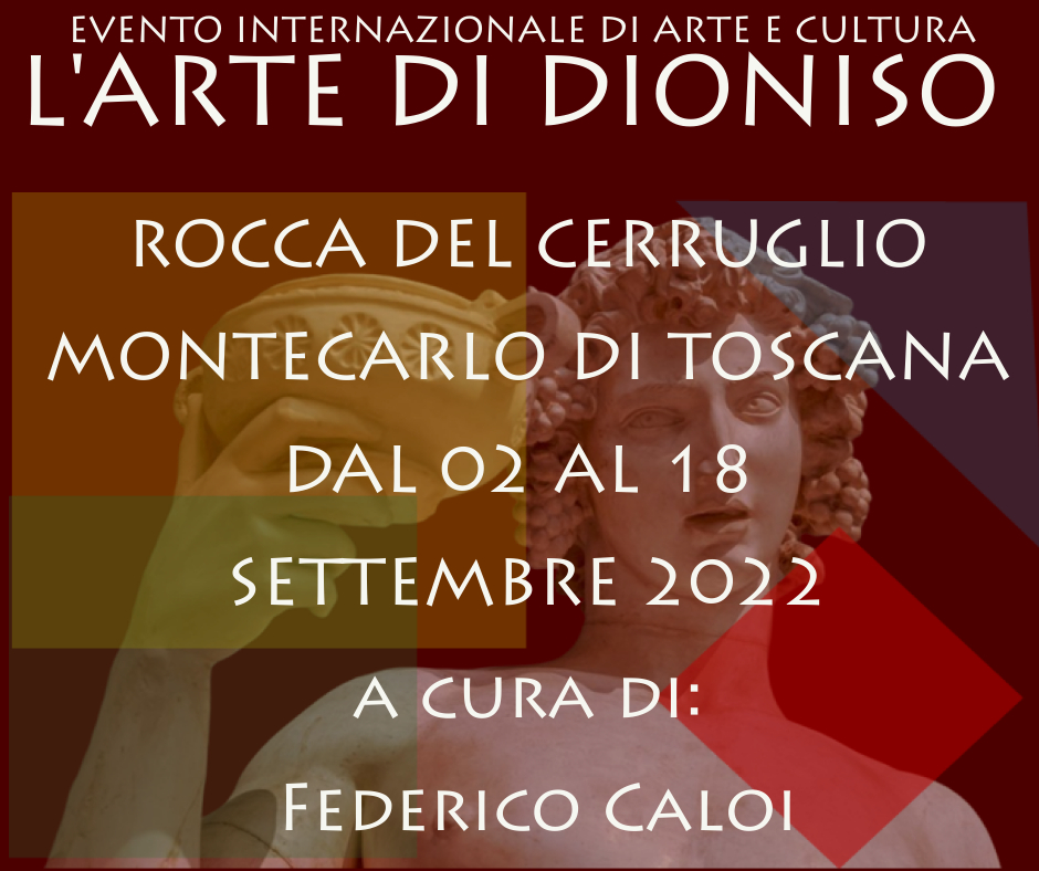 A MONTECARLO DI TOSCANA, in provincia di Lucca si svolgerà dal 02 al 18 settembre 2018, presso la ROCCA DEL CERRUGLIO, l’evento internazionale di arte e cultura “L’ARTE DI DIONISO”. La mostra è promossa con il patrocinio del comune di Montecarlo, ed è inserita nell’ambito della Festa del Vino 2022, manifestazione che vede numerose iniziative culturali di questa famosa località turistica.