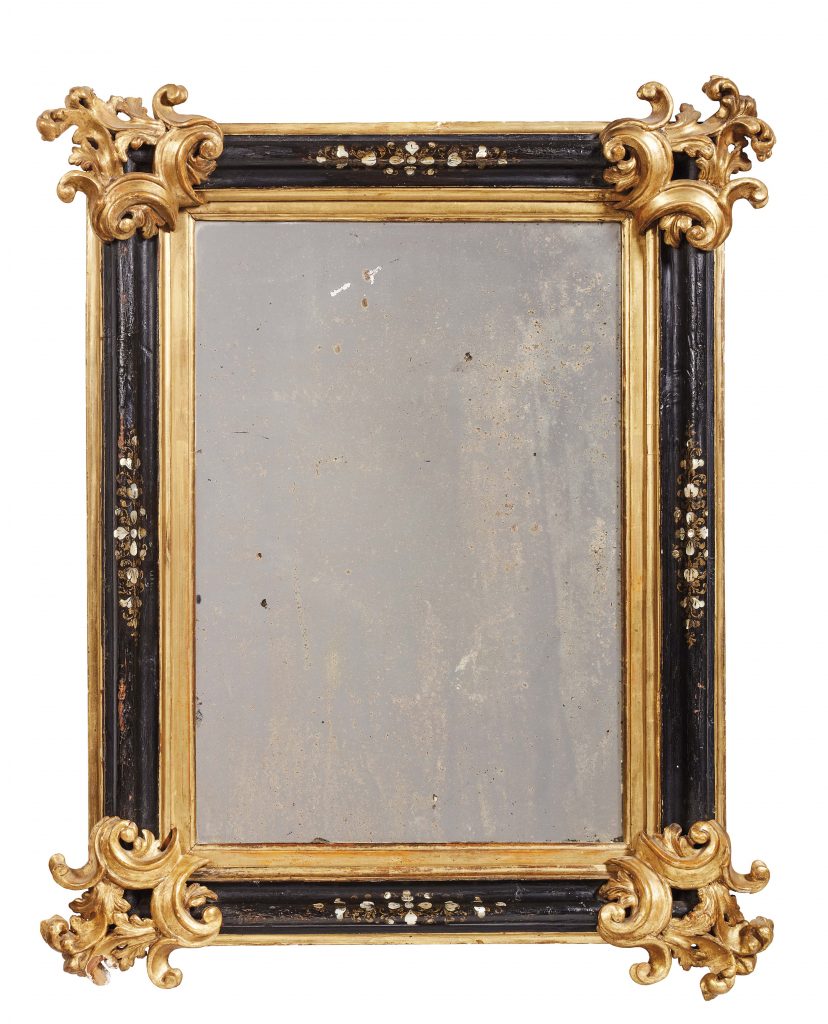Gli altri due esempi sono datati al XVIII secolo: una CORNICE di forma rettangolare è dorata e laccata con motivi di ramage fioriti che sono interrotti agli angoli da grandi foglie d’acanto in rilievo, così come importante è la cimasa, la richiesta è di 800/1.200 euro, mentre è di 6.000/9.000 euro quella per l’altra CORNICE settecentesca in legno ebanizzato, decorato da bouquet di fiori dorati e in madreperla, all’interno di fasce modanate in oro, agli angoli sono applicati grandi volute con motivi di foglie.