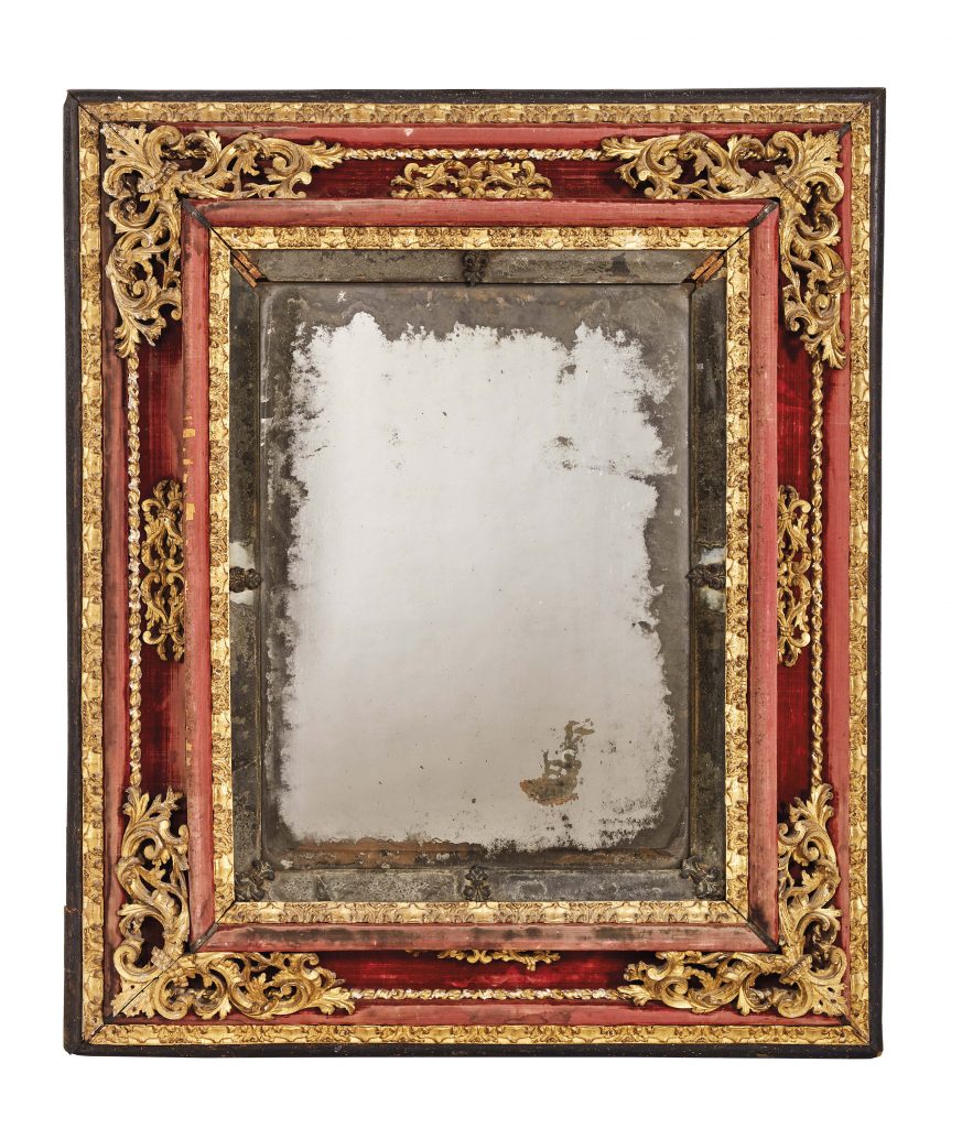 Concludiamo con la produzione romana del Seicento e Settecento, si tratta di una coppia di cornici e di una cornice di tipo Maratta della prima metà del XVIII secolo. Le CORNICI IN COPPIA hanno forma rettangolare e sono in legno intagliato e dorato con motivi di foglie e sottofoglie, nastri ritorti e motivi ovoidali, assieme sono valutate 2.500/3.500 euro. Di maggior impatto visivo è la CORNICE MARATTA rivestita in velluto rosso che contrasta con l’oro delle fasce di foglie e mezzefoglie, del motivo a nastro ritorti e dei rabeschi intagliati a giorno che ornano gli angoli e centrano i lati, la stima di questo esemplare è di 3.000/5.000 euro.