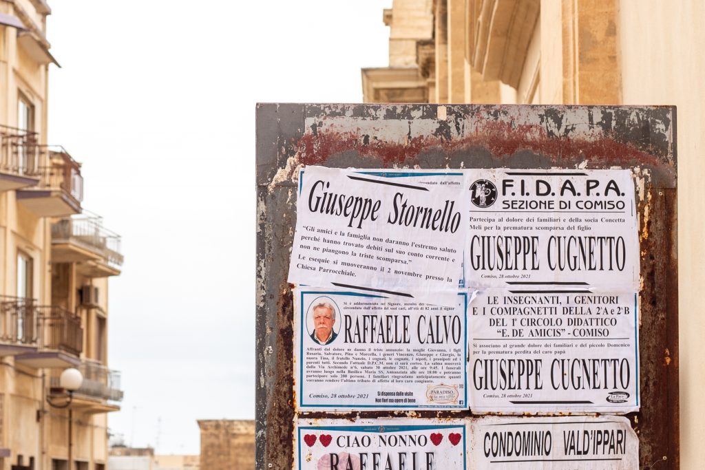 L’ARTISTA GIUSEPPE STORNELLO APPENDE I MANIFESTI FUNEBRI DELLA SUA MORTE NELLA CITTÀ DI COMISO