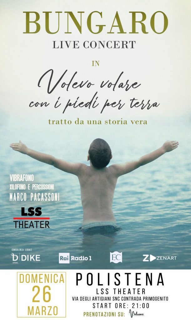 Il 26 marzo calcherà il palco dell’LSS Theater Tony Bungaro, in tour con il suo nuovo spettacolo: “Volevo volare con i piedi per terra”. Il bambino a braccia aperte, con gli occhi puntati verso il mare, rappresentato sulla locandina, è proprio il cantautore di fama mondiale che, da oltre trent'anni, scrive pagine importanti della musica italiana ed internazionale. A volare su questo mare insieme al celebre “artigiano della musica” è Marco Pacassoni con vibrafono, xilofono e percussioni.