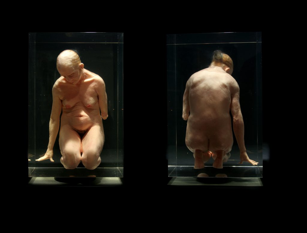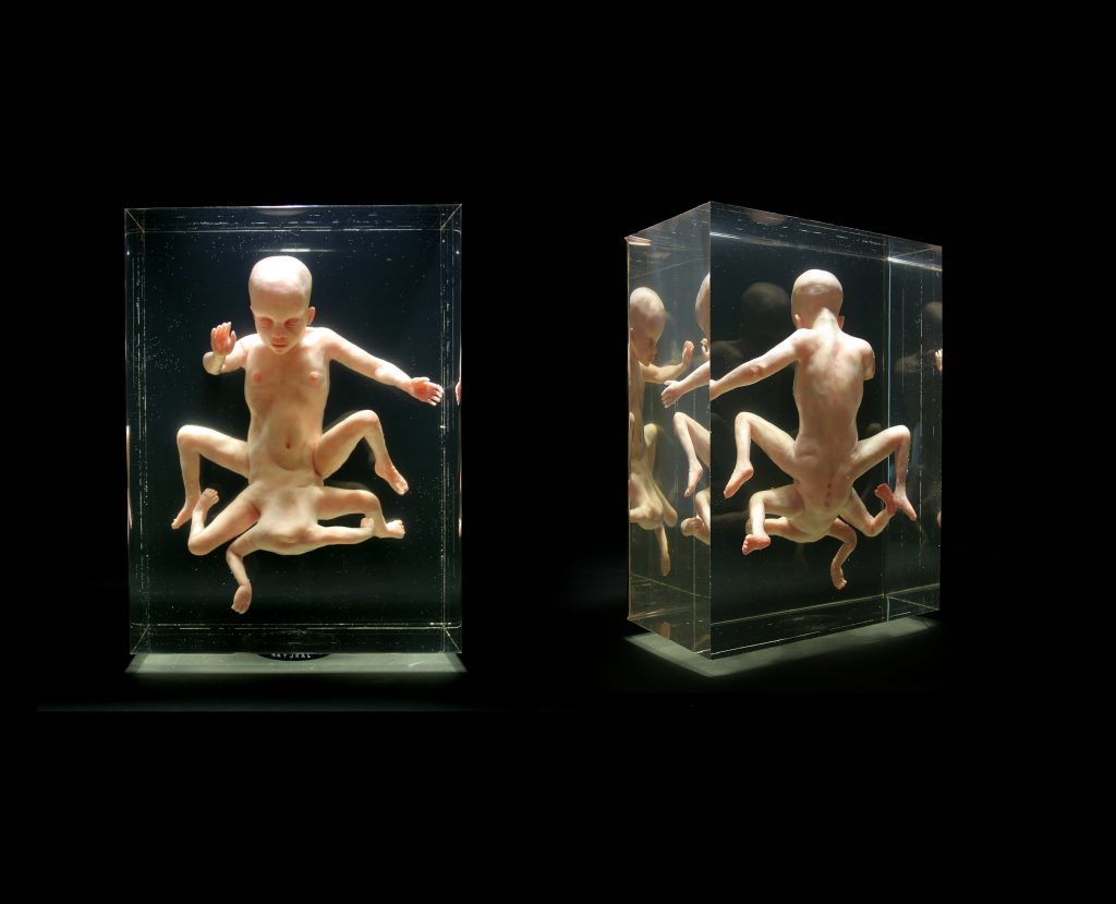 Attraverso una tecnica di modellazione del silicone, successivamente cristallizzato nella resina, i Santissimi creano meticolosamente sculture a misura umana (che così diventano specchio riflesso dello spettatore) di corpi indeboliti e crudelmente imperfetti, portatori sani di deformazioni emotive e fisiche. Corpi dagli occhi chiusi ed il volto impassibile. Corpi disturbanti ma immersi in una calma irreale perché hanno imparato l’angoscia esistenziale e riconosciuto l’incompletezza come condizione inevitabile dell’esistenza. Ogni opera suggerisce la promessa di un movimento che non arriva mai, dilatando il tempo in un unico, infinito attimo. E tra angoscia e malinconia, si susseguono fossili anatomici e corpi da incubo, fino ad arrivare a una scultura come “Mom”, per la prima volta in esposizione, in cui la forma torna all’origine e la carne diventa pura materia da plasmare, embrione indefinito che evoca inquietudini ancestrali. I Santissimi indagano forma e sostanza di esseri che hanno dimenticato la loro storia naturale e da dove provengono, in uno sfasamento continuo dell'identità. Una sorta di passione da laboratorio rivela l’empirismo filosofico come corrente culturale di riferimento dei Santissimi e si traduce nella messa in forma, in materia, in arte del pensiero filosofico-scientifico. La potenza delle immagini dei Santissimi, dunque, sconvolge e riscrive il concetto di pudore, di morbosità, di corpo in un orizzonte che contempla il cinema del primo David Cronenberg, alcune metamorfosi di Jan Fabre e il “corpo senza organi” teorizzato da Antonin Artaud.