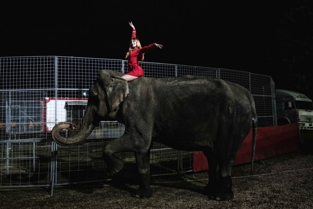 L’intero progetto prende le sembianze di un racconto, dove la camera del fotografo non si ferma solo davanti all’incanto di un trapezio sospeso nel vuoto tra i fumi e le luci di uno spettacolo circense, ma sceglie di spingersi oltre e seguire gli artisti nei backstage, ritrarli nei momenti di quotidianità̀, nei preparativi, nel rapporto con gli animali.