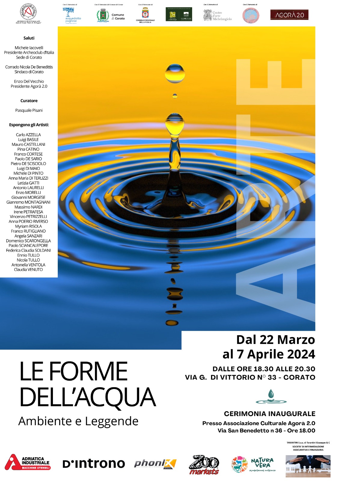 Promossa da Archeoclub d’Italia APS Sede di Corato, Presidente Michele IACOVELLI, la Mostra si è inaugurata il 22 marzo, nella Giornata Mondiale dell’Acqua, istituita dalle Nazioni Unite nel 1922, la Collettiva d’Arte LE FORME DELL’ACQUA -Ambiente e Leggende, curatore prof. Arch. Pasquale PISANI.