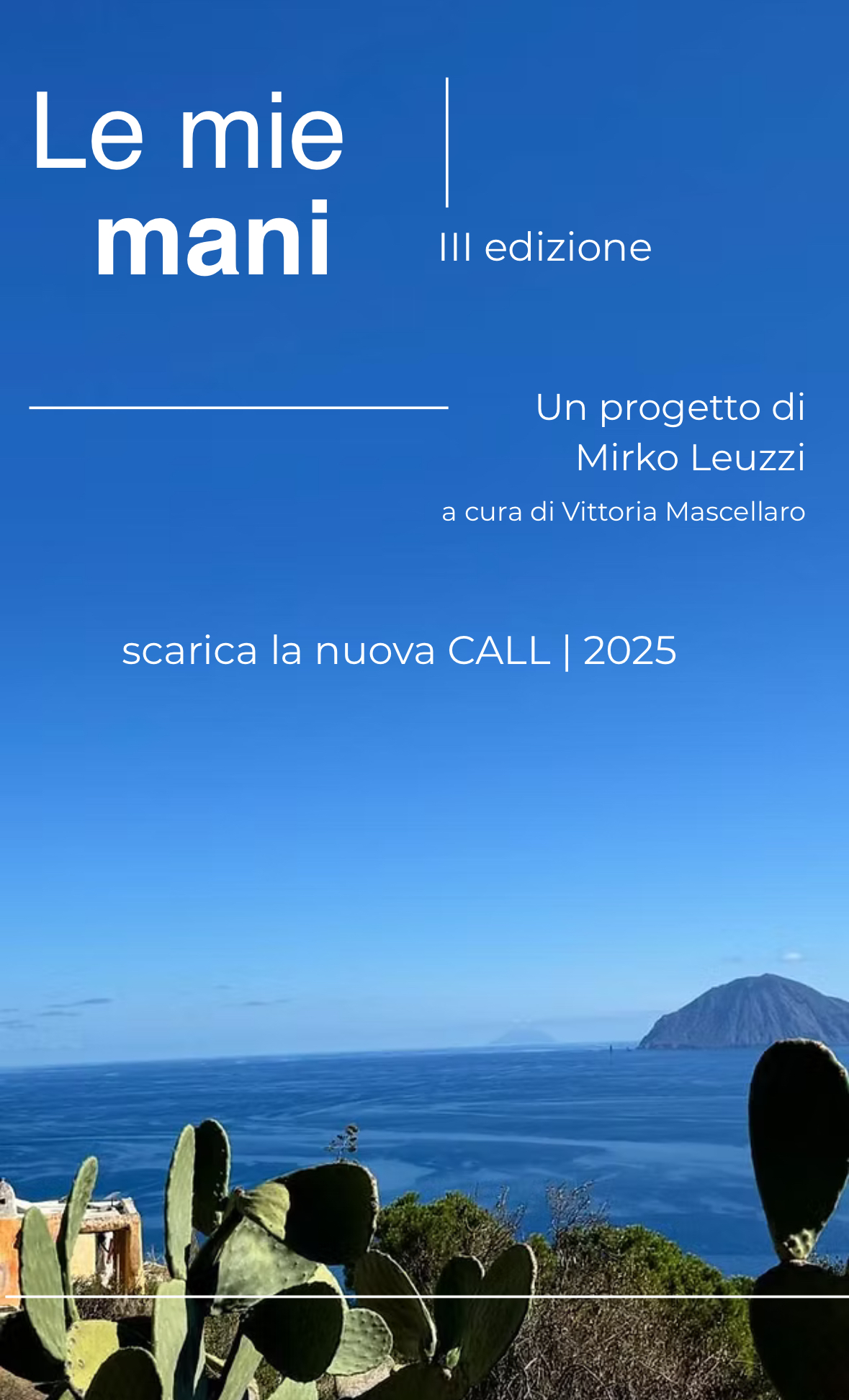 Il progetto "Le mie mani 2025" è una residenza artistica ideata da Mirko Leuzzi, giunta alla sua terza edizione. Si svolgerà nel mese di giugno sull'isola di Alicudi, in una casa isolata immersa nella natura. Il tema di questa edizione è "Paura della solitudine", una riflessione sulle dinamiche e le potenzialità del sentirsi soli.