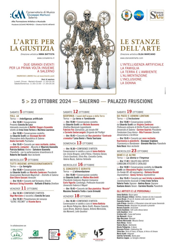 "Le Stanze dell'Arte", curato per la direzione artistica da Olga Marciano, trasformerà il Palazzo Fruscione in una vera e propria casa per gli artisti contemporanei. Ogni piano dell’edificio ospiterà opere di 21 artisti, creando un’esperienza immersiva in cui il pubblico potrà esplorare i diversi linguaggi. Tra gli autori che esporranno le loro opere figurano Imma Battista, Cinzia Bisogno, Laura Bruno, Concetta Carleo, Lello D'Anna, Filomena Daraio, Roxana Esposito, Cinzia Gaudiano, Lello Gaudiosi, Cristina Iotti, Ida Mainenti, Olga Marciano, Antonio Mariconda, Kane McLay, Valeria Nuzzo, Nicola Pellegrino, Giacomo Pirozzi, Silvia Rea, Maria Scotti, Sabrina Tortorella e Beatrice Zappia.