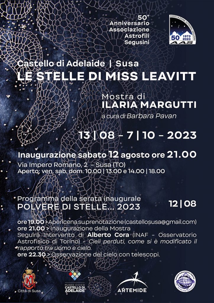 In occasione di questo significativo evento, l'Associazione ha il piacere di presentare la mostra dell'artista Ilaria Margutti, intitolata Le stelle di Miss Leavitt all'interno del suggestivo Castello della Contessa Adelaide a Susa.