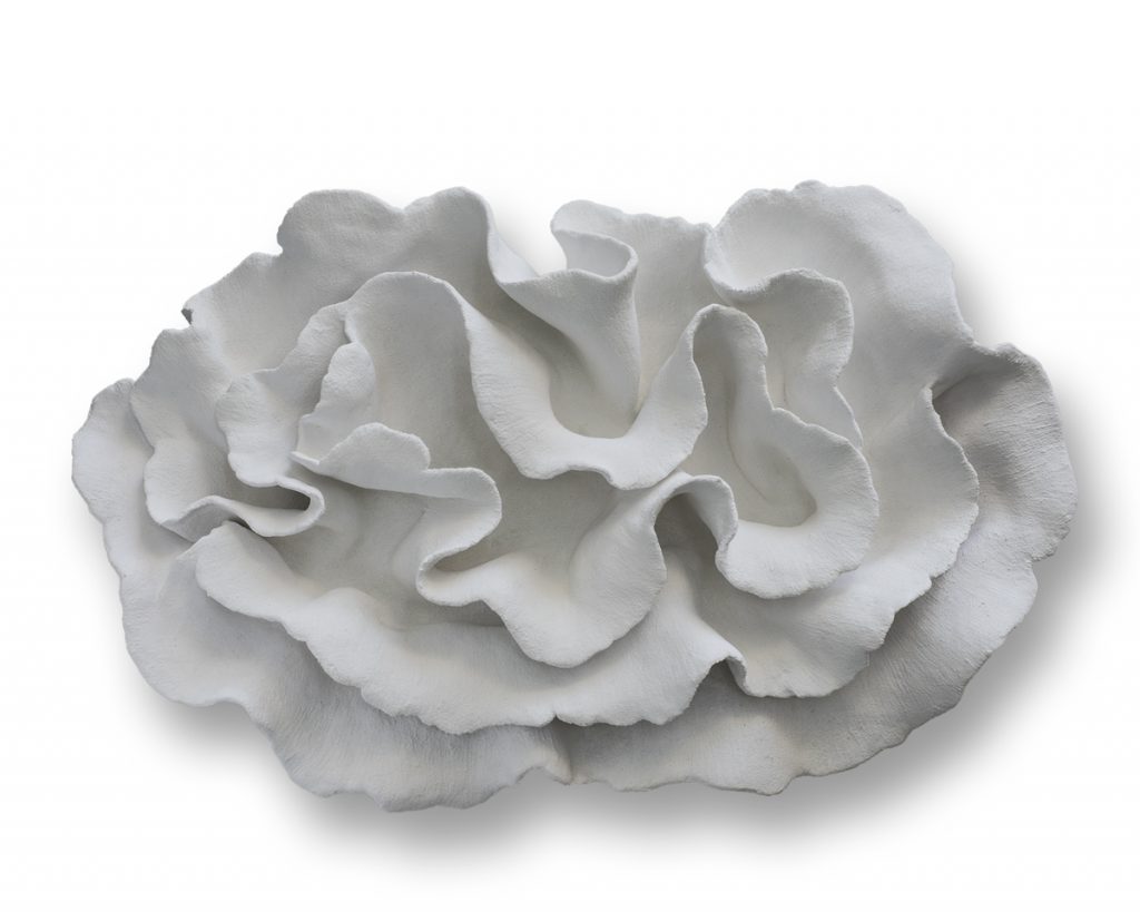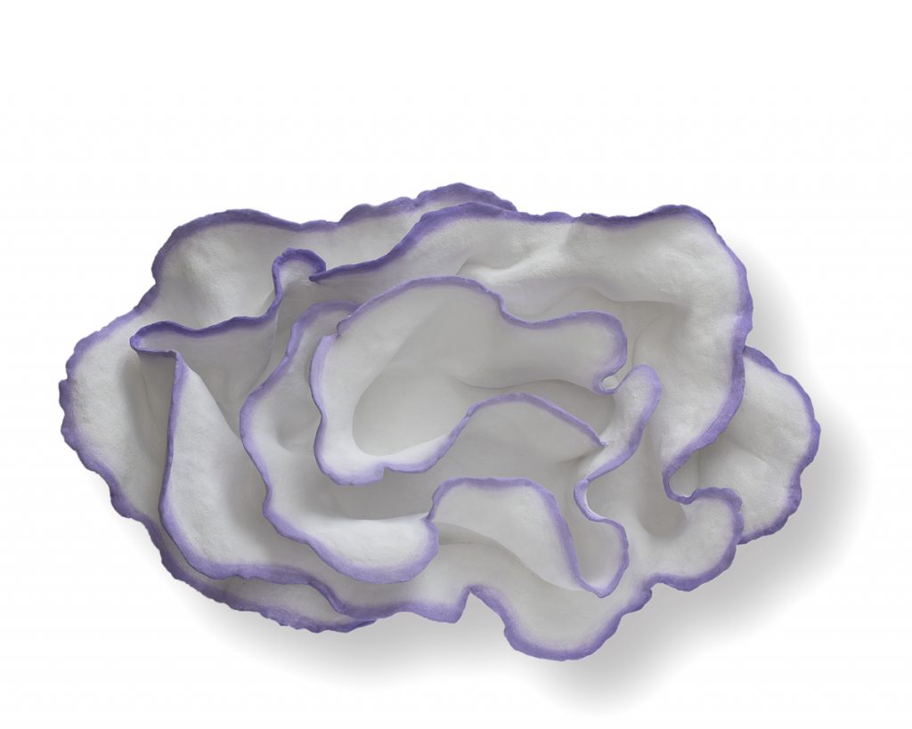 Le forme plastiche, sono generate e composte da linee sinuose che ammiccano a petali di rose e allo stesso tempo a qualcosa che rimanda all’origine della vita o del mondo, labbra di una vulva o a valve di conchiglie.