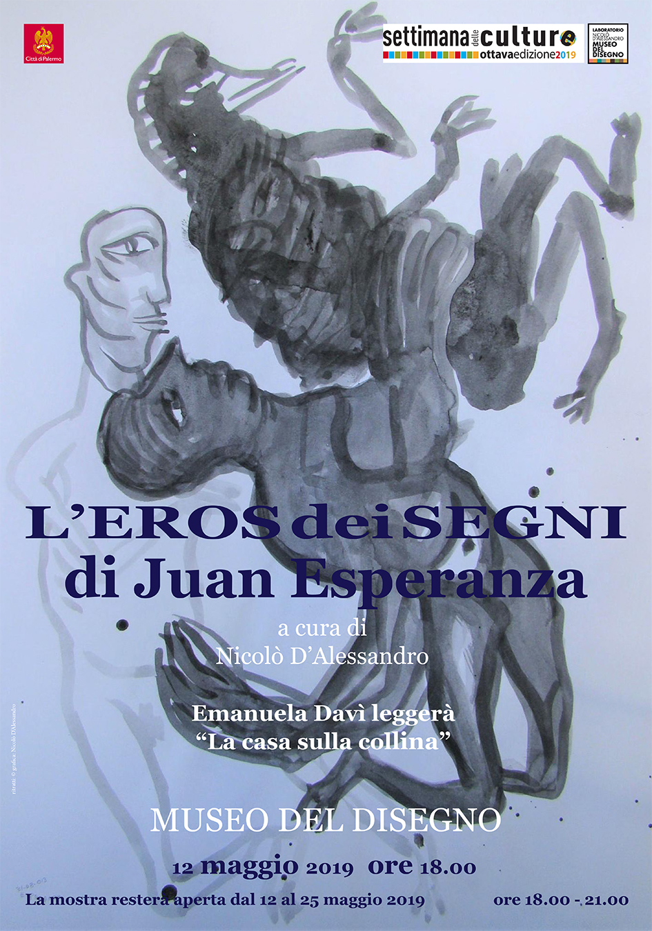 Nell’ambito della SETTIMANA DELLE CULTURE, ottava edizione, 2019 presso il MUSEO DEL DISEGNO, via Mogia, 8 a Palermo, domenica 12 maggio 2019, alle ore 18.00, si inaugura la mostra L’EROS DEI SEGNI dell’artista messicano JUAN ESPERANZA. Una selezione di recenti disegni a china. Dell’artista Nicolò D’Alessandro scrive tra l’altro: “I disegni essenziali di Juan, appositamente realizzati per questa mostra, restituiscono, come avviene in tutta la sua produzione artistica, il senso del non conosciuto, dei suoi gioiosi enigmi, dei suoi orrori. Un atto generoso, il suo, ma nello stesso tempo severo, dissimulato da un’apparente semplificazione delle forme, che ambiscono alla purezza e alla libertà”. Juan non parla di bellezza, ma affronta consapevolmente lo scoglio della verità.
