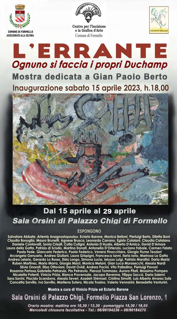 Il Centro per l’Incisione e la Grafica d’Arte del Comune di Formello, diretto da Vinicio Prizia, presenta la mostra collettiva dedicata al maestro Gianpaolo Berto, recentemente scomparso nel novembre del 2022, dal titolo ‘L’Errante’. Questo personaggio, l’Errante, appunto, ricorre spesso nell’opera del maestro in forma di incisione, pittura, disegno, e rappresenta un tipico barcaiolo del Polesine, terra d’origine di Berto, ma il suo significato è più vasto e misterioso. È riferito al viaggio della vita che ognuno di noi intraprende nascendo e che non possiamo che affrontare? È la rappresentazione mitica della nostra anima, eterna migrante, che attraversa scenari reali ed immaginari per curiosità (Ulisse), per fare esperienza del bene e del male (Faust)? Berto/Errante ha navigato ovunque nei mari dell’Arte: quelli notturni e sognanti delle sue Venezie, con le apparizioni dei numi tutelari della madre, di Berenice, di Carlo Levi, ma anche, con coraggio ha affrontato le burrasche dei segni di Pollock e di Picasso, i luoghi metafisici di De Chirico, le accensioni cromatiche di Renato Guttuso e di Tono Zancanaro, amati maestri che ha approfondito ed attraversato. Questo retaggio è alla base delle opere presenti in mostra, realizzate da più di ottanta artisti, e tutte testimoniano l’affetto e l’impronta che Berto ha lasciato in ognuno di loro sia come amici che come allievi nel suo insegnamento presso la cattedra dell’Accademia di Belle Arti di Roma nel suo corso di Tecniche dell’Incisione, ed ora, in molti, sono docenti nei licei e nelle accademie.