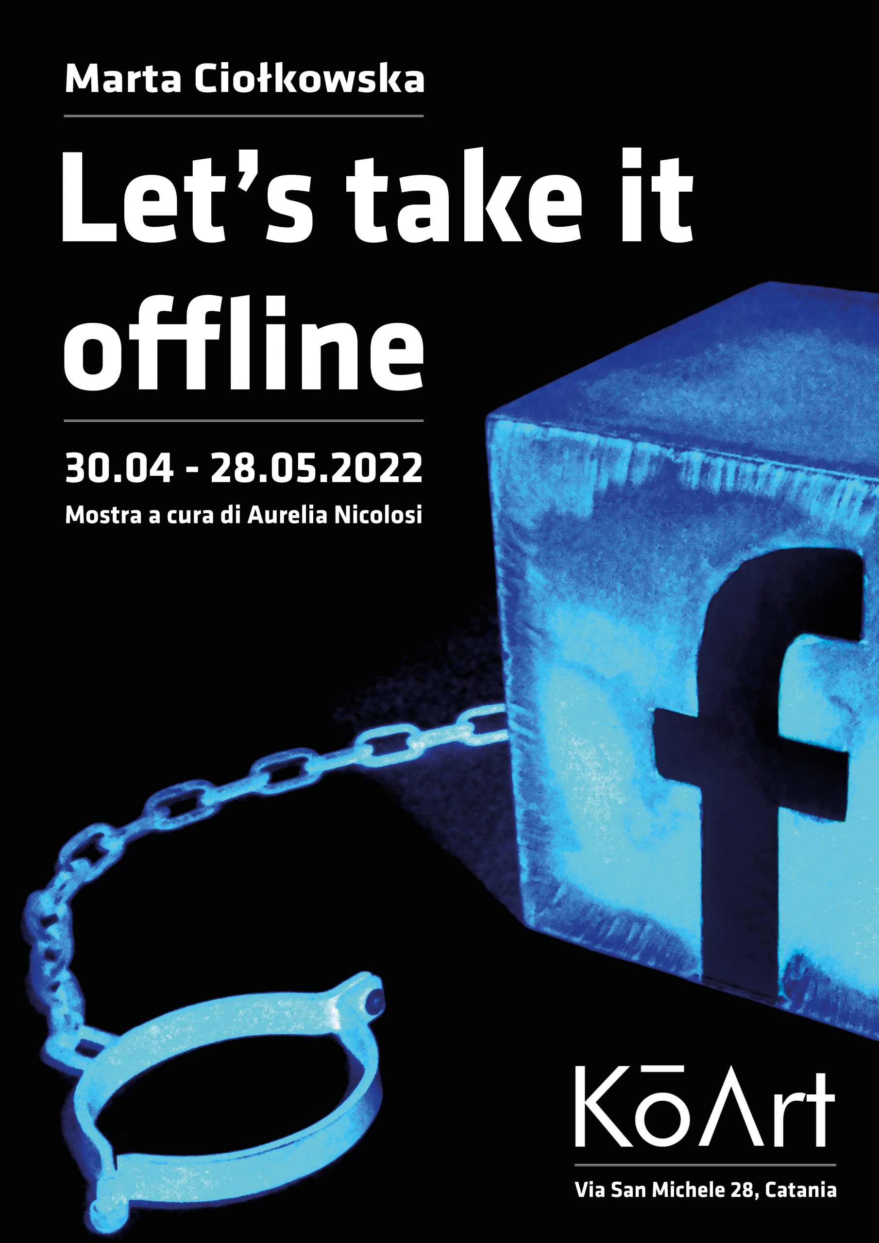 S’inaugura sabato 30 aprile alle ore 17.00 presso la galleria KōArt/Unconventional Place Let's take it offline, la personale di una giovanissima artista di origine polacca, Marta Ciołkowska, che segna una nuova tappa nella volontà di ricerca e valorizzazione dell'arte contemporanea in un territorio curioso e sempre aperto a nuove sfide come quello catanese. L'esposizione a cura di Aurelia Nicolosi, ruota attorno al concetto di comunicazione e all'utilizzo smodato dei social media che deformano e trasformano le menti e gli atteggiamenti delle persone. Facebook diventa il 'cubo' al piede che blocca ogni movimento e volontà di emancipazione; il telefonino assume l'identità di una protesi, di un prolungamento naturale di una mano; la sfera trasparente diventa quella barriera invisibile che circonda chi s'immerge col suo cellulare nell'interazione virtuale quotidiana, e cosi via... Ogni istallazione offre uno spunto di riflessione sui molteplici aspetti di una società dove le barriere non sono solo più fisiche ma anche mentali e digitali. Il visitatore è, pertanto, chiamato ad interagire con le opere e a riflettere sulle varie pericolose implicazioni dell'Era del WEB. Video e installazioni caratterizzano l'esposizione in una sorta di percorso catartico, dove gli intrecci dei cavetti, rappresentano la ragnatela da cui è necessario svincolarsi per raggiungere la propria libertà. In un gioco di rimandi l'artista stimola il visitatore con costanti provocazioni, che suscitano in un primo momento ilarità per lasciare poi spazio alla presa di coscienza e alla volontà di spegnere tutto per costruire una identità migliore.