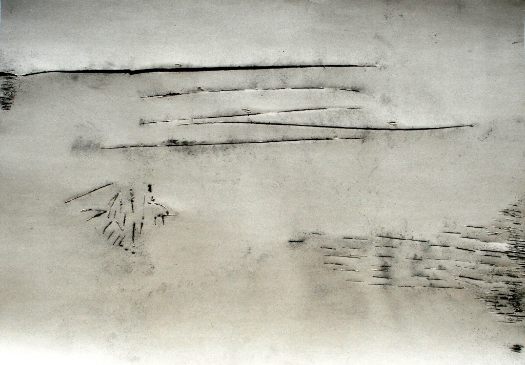 Un allestimento scarno che accoglie in sé tutti i segni che lo spazio di Zona Franca -Casa del mare ha ospitato e contenuto finora. Un video in cui la messa a fuoco scompone l’attenzione di chi guarda e richiama letture non convenzionali. Due grandi tele a sinistra e, a destra, alcuni cartoni e diverse foto raccolte in un lungo scaffale di legno che rimandano a scritture appena percepite o scritture asemantiche, un modo di scrivere il mondo che trova altre direzioni, aspetti, pensieri non catalogati nei quali esprimersi. Tratti polisemici in cui la libertà sposta i confini della scrittura e in cui alcune scritture provano a scioglierne altre incatenate. Segni dal fondo del mare. Questa è la proposta di Zona Franca per questa impersonale che si presenta come una piccola antologica.