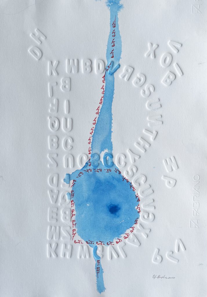 Calogero Barba cosciente del valore evocativo della scrittura creativa, dispone il suo sug-gestivo rapporto con le impressioni visive delle lettere “sottopressione” da cui scaturiscono i ritmi della forma per andare al di là del segno impresso sul bianco della carta. «Nel tem-po della liquidità e del bla bla bla, dei social media diffusi ovunque, tutto è comunicazione, la parola perde di continuo il suo forte significato semantico. La libera scrittura impressa sulla carta interagisce con la dimensione del formato del foglio evidenziando il rapporto con lo spazio, il segno e la fragile materia della carta – racconta Barba –. Le libere scrittu-re impresse, lontane dalle strutture grammaticali e dall’ordine del discorso lineare, sono di-sposte sul piano e impresse dal torchio calcografico assumendo il valore di una sosta visi-va dello sguardo che non svela il silenzio della stessa storia», continua a spiegare l’artista che con questa mostra intende contribuire alle attività sociali e culturali a Danisinni e del Mu.S.Da. di cui è membro, ma anche un omaggio a questo piccolo rione che conserva la sua memoria agreste con i suoi orti, i coltivatori, il rapporto con gli animali, una dimensione fortemente umana e senza tempo in una città come Palermo che ha subito profonde ferite causate da un’urbanizzazione talvolta incontrollata e spropositata.