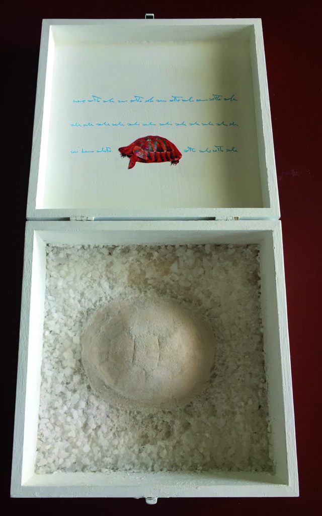 Le scritture di Calogero Barba in mostra al Museo Sociale di Danisinni giocano sul campo geometrico del foglio bianco con morbidi valori tonali dati dall’incidenza della luce che si posa sui leggeri rilievi quasi impercettibili e sul negativo a secco dell’incavo creato dalle lettere impresse dai rulli calcografici. Le sue opere bidimensionali esplorano la plasti-cità della natura in assemblaggi polimaterici, “oggetti” della terra recuperati durante pas-seggiate nei paesaggi agresti siciliani, come il carapace di una tartaruga che compone l’opera “Sotto sale” in cui la chiocciola simbolo che Barba usa sin dagli anni ’80 assume un valore plastico che incontra la scrittura, la pittura, dove il recupero della memoria è affida-to all’uso del sale prodotto naturale che l’uomo ha da sempre utilizzato per la conservazio-ne, ma anche sistema premonetale nelle civiltà del baratto, elemento simbolico di questa isola di sale che è la Sicilia; o ancora “Verso l’Arca” una sorta di manifesto ecologico dell’artista dove la parola incontra e si innesta su pittografie zoomorfe tracciando attraver-samenti e labirinti. «Favorito dall'appartenenza ad un territorio di interesse archeologico e di tradizione agreste-pastorale – scrive Angela La Ciura nel testo critico che accom-pagna la mostra - mosso da un'innata curiosità, Calogero Barba colleziona reperti con cui stabilisce un'affettuosa dialettica. Le vestigia di un lontano passato o gli umili resti di una economia povera, sottratti all'oblio, tra le sue abili mani, rivivono come per magia, in virtù della materia sapientemente manipolata e del pigmento, denso di allusive valenze simboli-che».