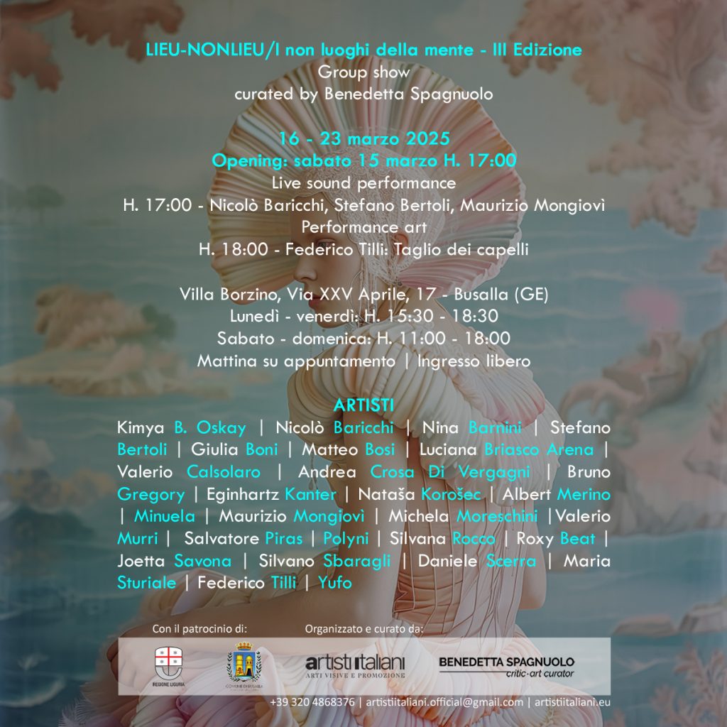 La terza edizione della collettiva d’arte contemporanea LieuNonLieu/I non luoghi della mente prende il via negli spazi suggestivi di Villa Borzino, a Busalla (GE), trasformando questa dimora storica in un punto d’incontro tra arte e riflessione sui concetti di “luogo” e “non luogo”.