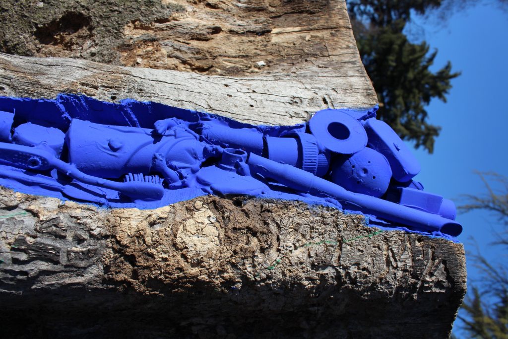 L’artista ha realizzato una serie di interventi artistico-ambientali che hanno trasformato i tronchi recisi in vere e proprie sculture a cielo aperto, confrontandosi con un materiale inusuale, la plastica, che rappresenta il materiale più diffuso nelle società industriali moderne.