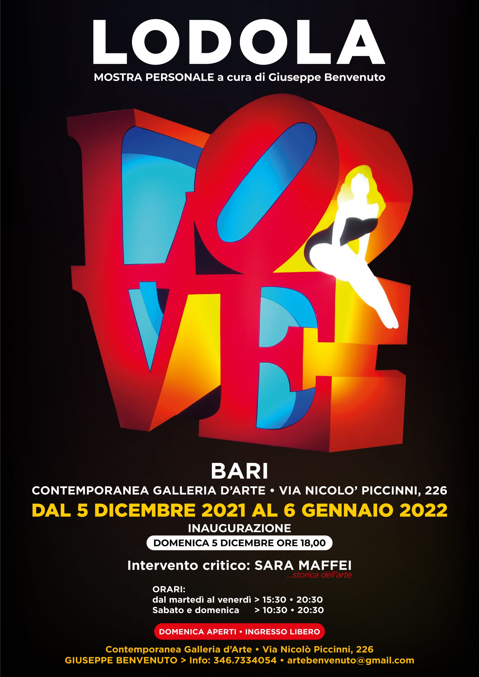 “Domenica 5 dicembre 2021, presso la Contemporanea Galleria d'Arte di Bari, avrà luogo l'inaugurazione della mostra personale di Marco Lodola a cura di Giuseppe Benvenuto e Sara Maffei, visitabile fino al 6 gennaio 2022.