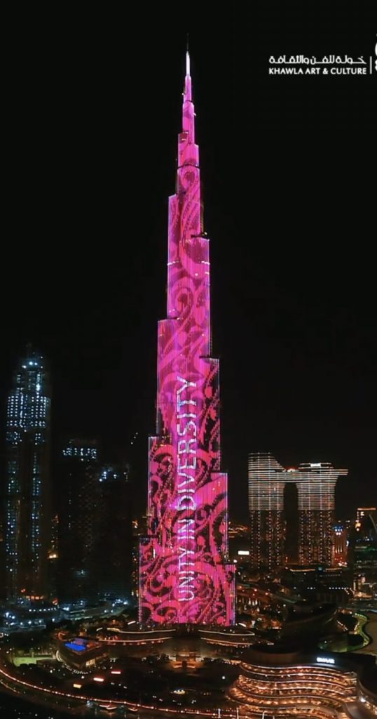 La stessa artista ha partecipato anche alla serata dedicata in onore degli artisti internazionali a Dubai con vista sul Burj Khalifa, il più alto grattacielo al mondo, personalizzato per l’occasione con il titolo dell’esclusiva collettiva internazionale.