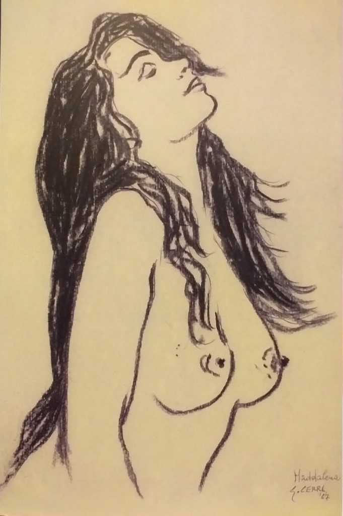 Giancarlo Cerri presenta 43 opere, la maggior parte disegni a carboncino o inchiostro su carta, divise su quattro sezioni: 20 figure tra ritratti e nudi femminili, 9 tra paesaggi e nature morte, 8 sequenze e 6 dipinti di arte sacra. I lavori presenti a Milano, molti dei quali mai esposti sino ad ora, sono stati tutti realizzati tra gli anni Sessanta e il 2004, anno in cui la grave maculopatia ha costretto l’artista prima a rallentare e poi a fermare per oltre dieci anni la propria attività pittorica.