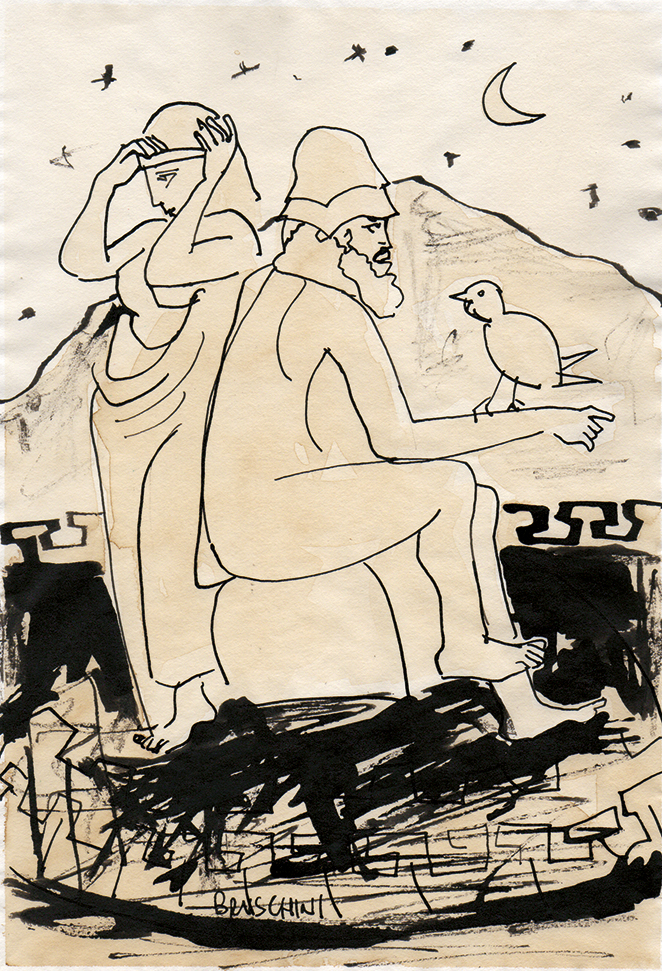 Il verso dell'Iliade che dà il titolo alla mostra - Scendeva simile alla notte - e che nel poema omerico è riferito al dio Apollo, è qui rivolto anche alla figura di Dioniso, dio greco del vino e dell'ebbrezza, archetipo della vita indistruttibile secondo la celebre definizione di Károly Kérenyi.