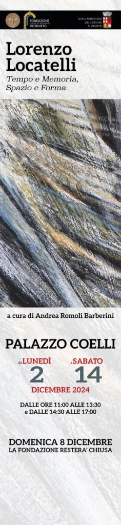 A partire da lunedì 2 dicembre (fino al 14 dicembre) le Sale espositive di Palazzo Coelli, sede della Fondazione della Cassa di Risparmio di Orvieto faranno da cornice alla mostra Lorenzo Locatelli: tempo e memoria, spazio e forma.