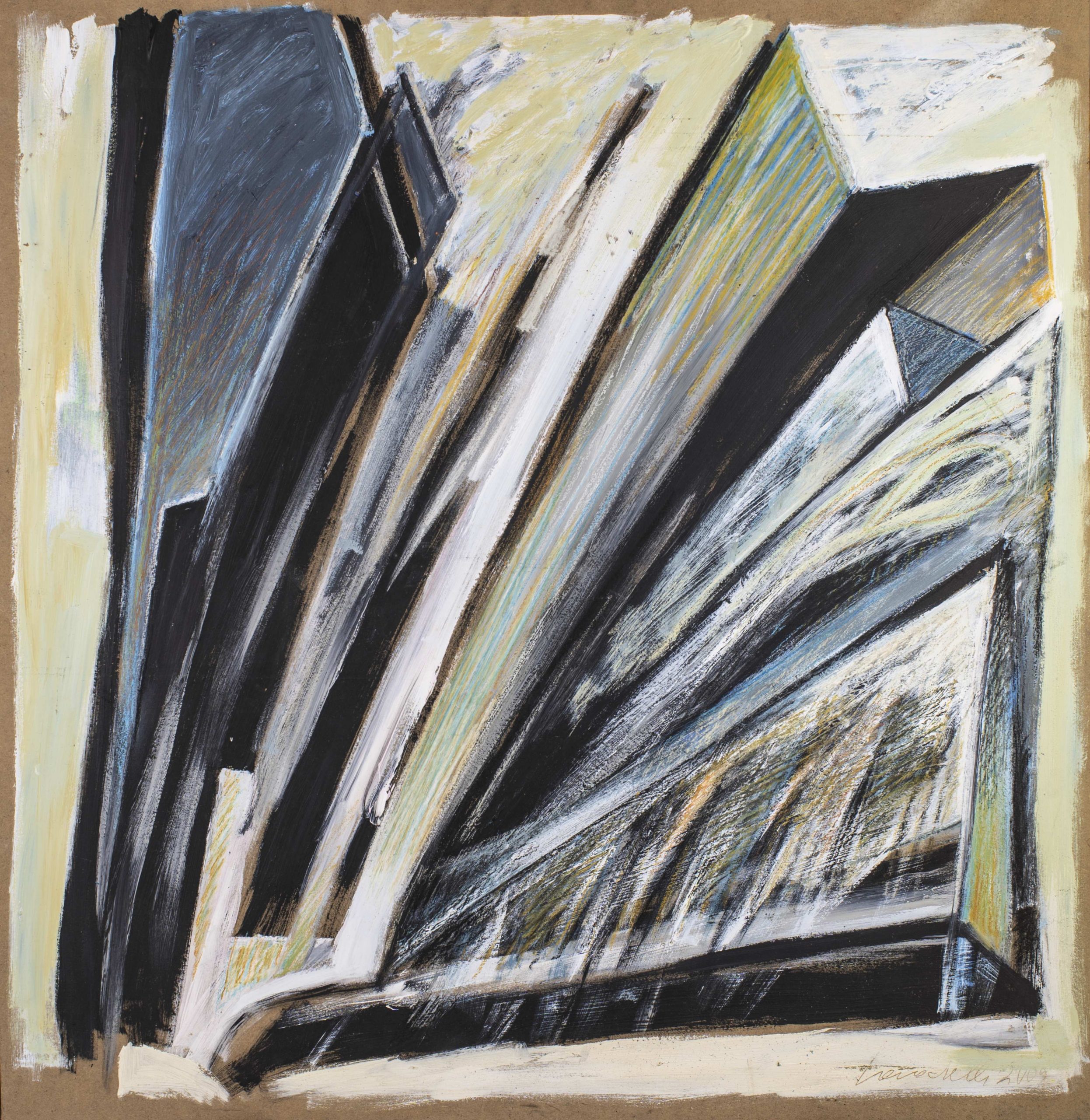 […] L’attenta osservazione di un drappo barocco, di una campata gotica o di semplici volumi immersi in uno spazio metafisico potrà quindi rappresentare il momento primo, lo spunto di partenza per attivare quel suo fare agile, aperto, incontrollato e senza progetto, che ricorda molto da presso l’automatismo psichico surrealista, attraverso cui l’artista può liberare le sue forme. Forme che, nella loro architettonica strutturazione, paiono scaturire dall’energia e dalla perentorietà di un segno che, unitamente al colore, costruisce e, sapientemente, costituisce piani e volumi per poi scomporli, quindi negarli, distruggerli e, ancora, riassemblarli in una sorta di accattivante e caleidoscopico palinsesto, leggibile per velature, dagli esiti suggestivamente ambigui perché intrisi di memorie.