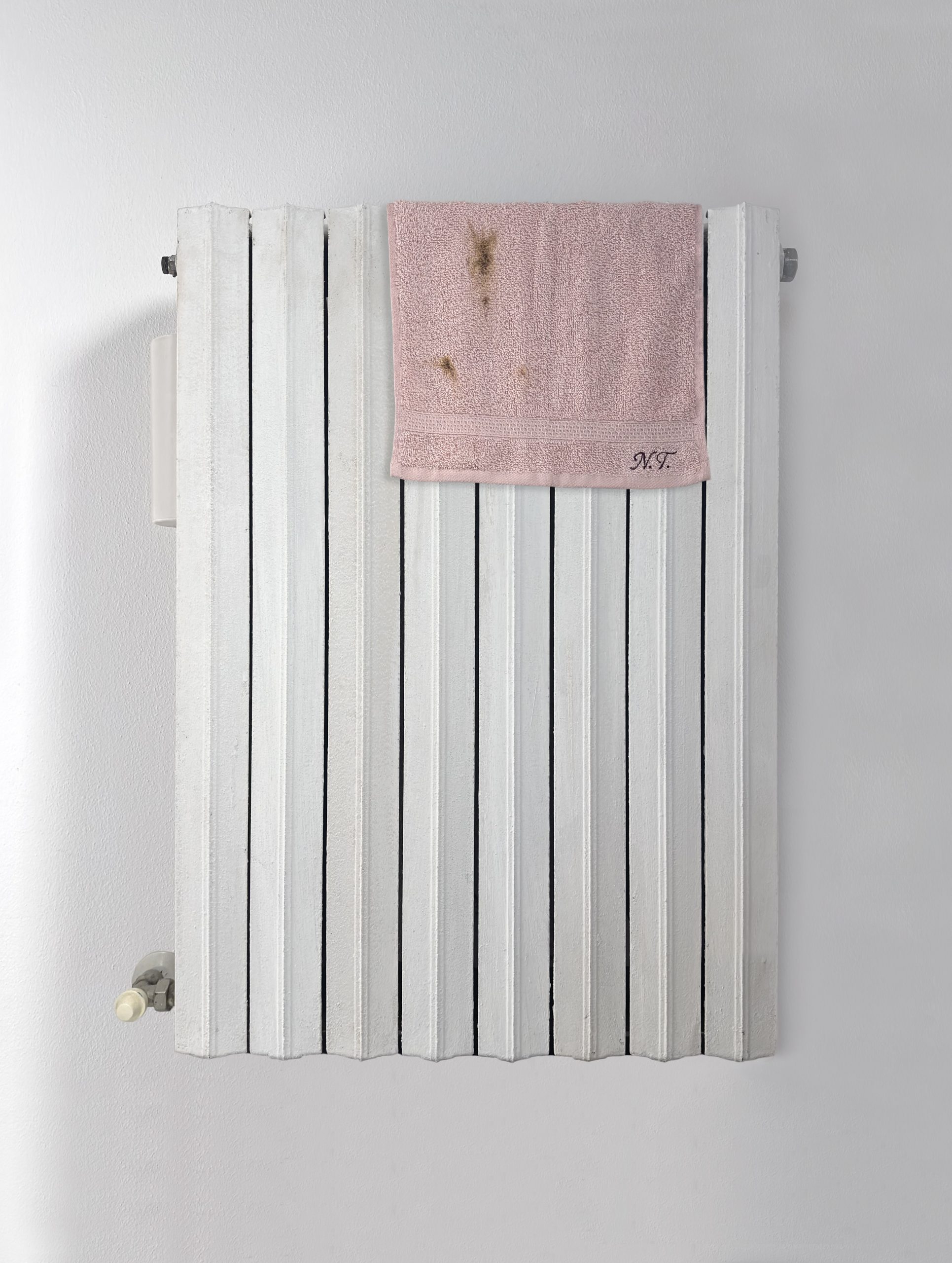 Su un semplice calorifero domestico, una salvietta da bidet apparentemente sporca di materia organica.