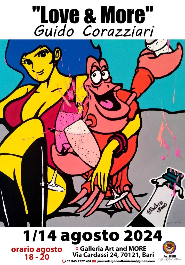Love (Amore) & More (Altro). Cosa è mai questo “Altro”? Arte prima di tutto, ma anche fantasia, sogno, illusione, inganno… “A-more”. Non è forse già tutto presente in questa parola, che in fatto di “fluidità”, di “indefinibilità”, fa a gara da sempre con la parola Arte? Per Guido Corazziari le due “cose” si con/fondono a vicenda. L’uno diventa sinonimo dell’altra, fonte di ispirazione, di energia, di vita. Si può vivere senza amore? No di certo! Si può vivere senza arte? Per Lui è impossibile. Tema centrale dei suoi dipinti, ad acrilico su tela, dal dichiarato sapore Pop. Corazziari mette a nudo le proprie emozioni, le fantasie più audaci o buff, con leggerezza e concettualità. Sono ormai cinquant’anni che lo fa, giocando, esorcizzando ogni paura ed ogni delusione. Non si può dire che non aiuti a restare giovani!. Guido Corazziari