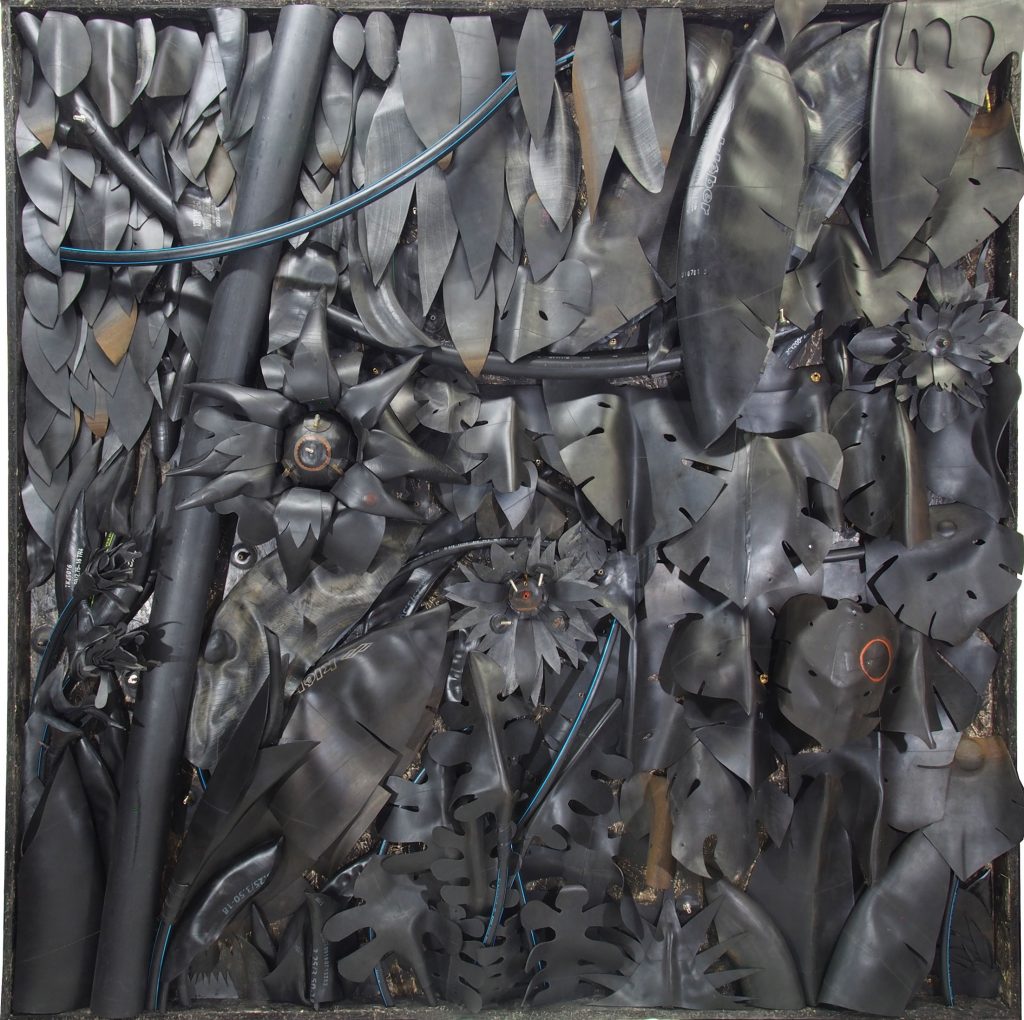 Dalla terra alla luna radicalizza lo sguardo di Luca Matti sulla città. Non più e non solo la selva di edifici irrompe dalle sue tele; ora l’intero ecosistema appare aggredito dalla presenza umana. Una natura mutata, ormai divenuta sintetica, emerge rigogliosa dalle giungle dipinte a bitume o scolpite nelle camere d’aria.